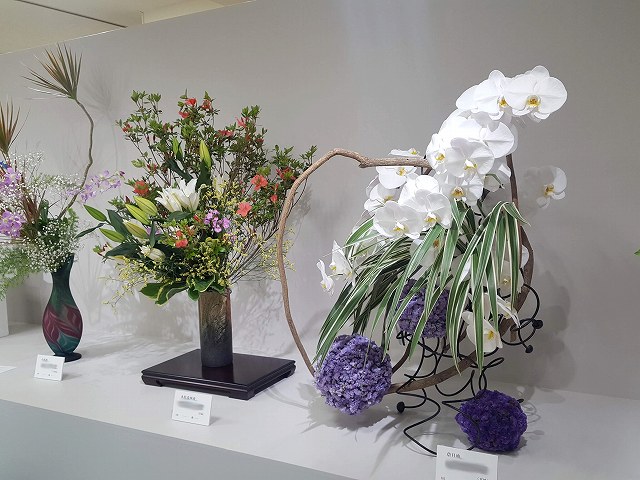 日本いけばな芸術協会花展出品作と薔薇シュネーケーニギン