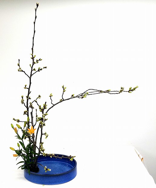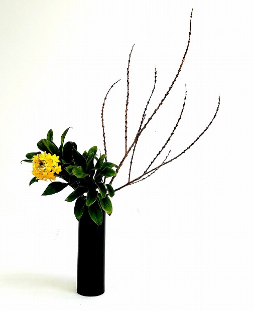 山茱萸(さんしゅゆ)とシンビジウムをいける ☆ 生徒様達のいけばな