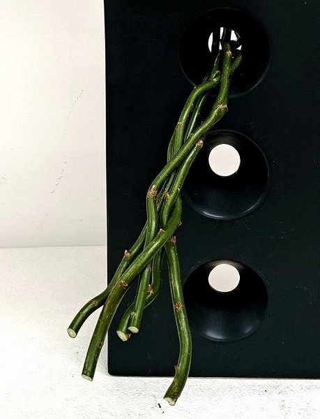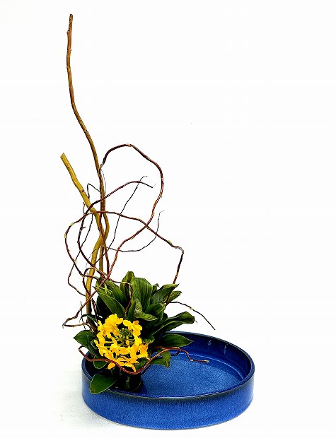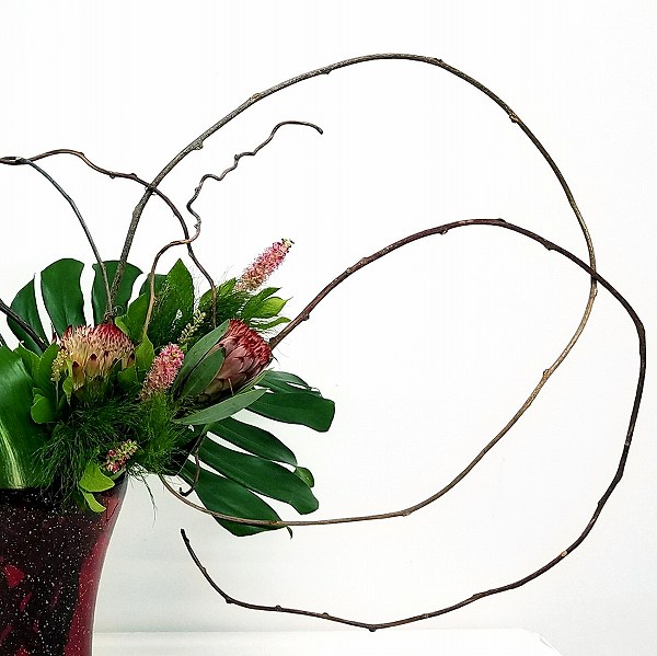 枝を雲竜柳にした組み合わせ花材。