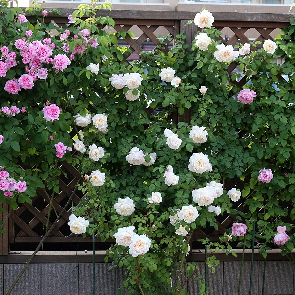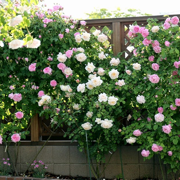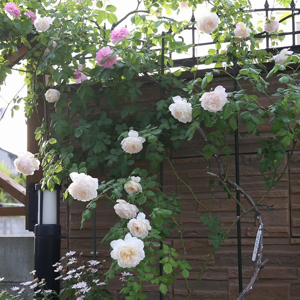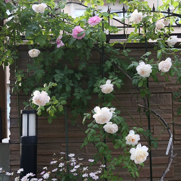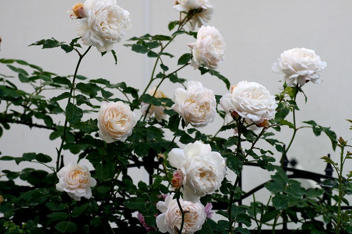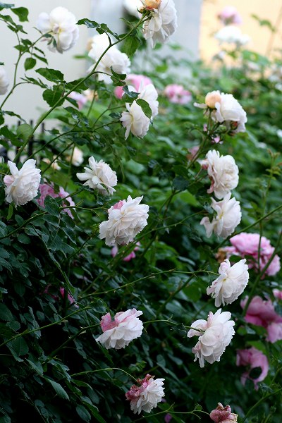 大きな塊が細い枝をアーチ状にたわませる咲き方は、力強い自由咲き。