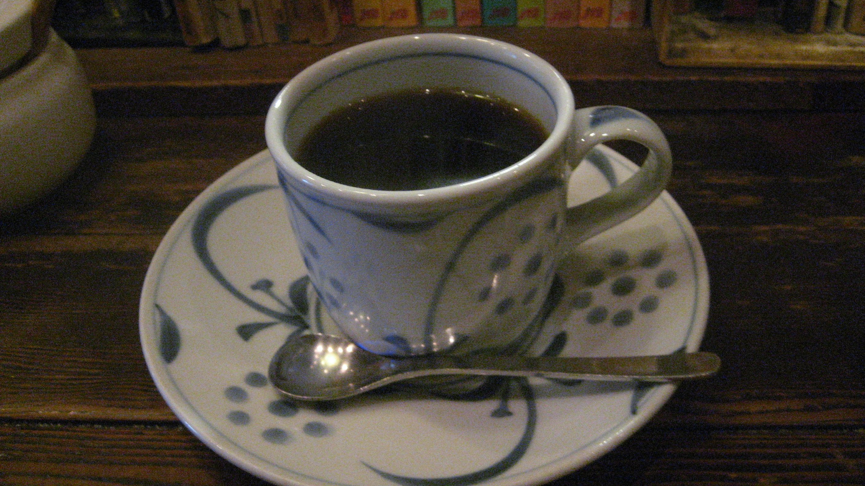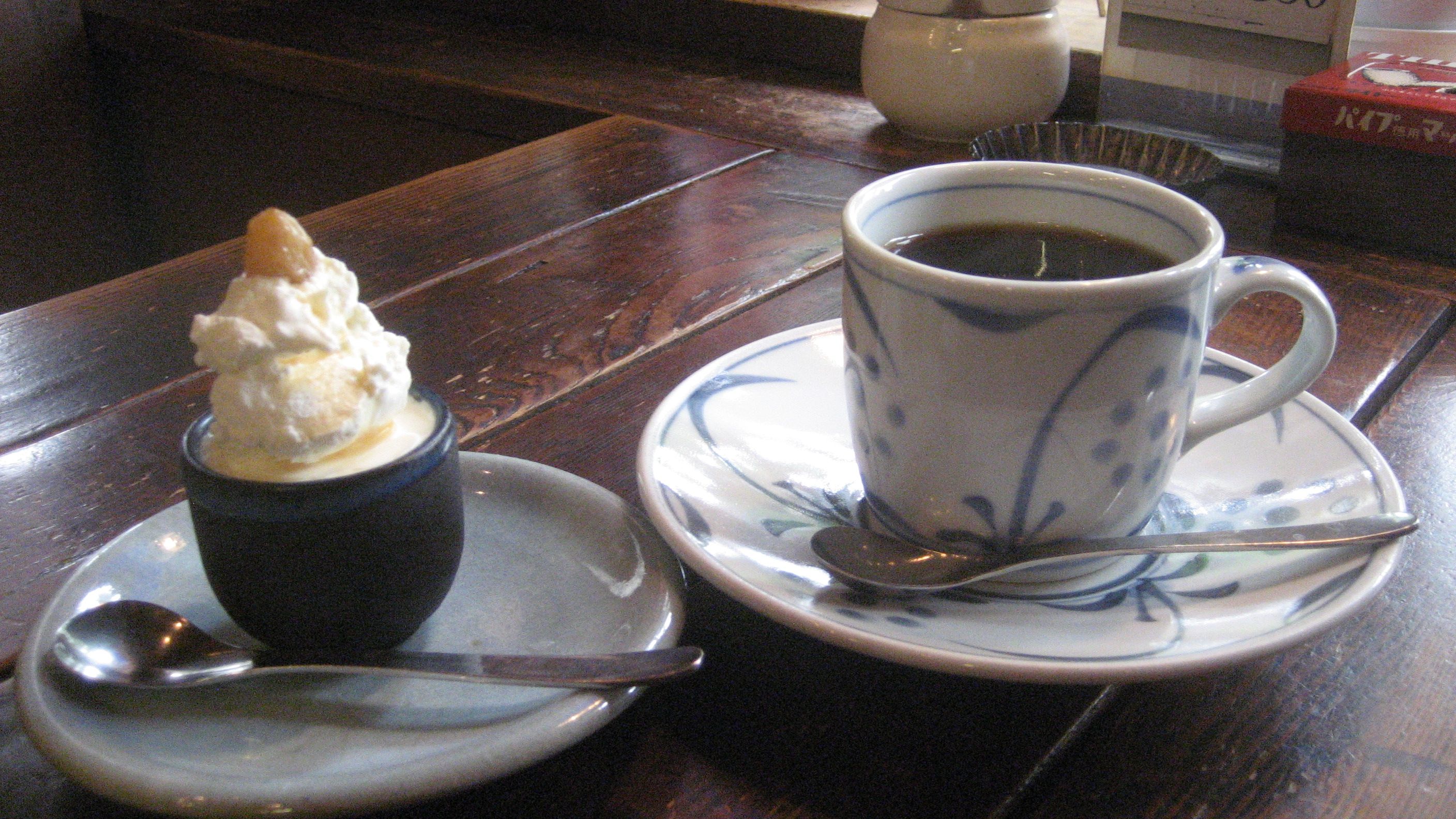 たまには、こんなのもいいかな~ と思って、今朝 頼んでみました。 コーヒーと小さなケーキ……女の子みたいでしたね この日は「ジャワ・ロブ」っていうストレート・コーヒーを飲んでみました。香ばしいコーヒーで、アッサリ気味ですが美味しかったです。 手作りチーズケーキ……ぐい吞みが容器になっていて、とてもとても小さいですが甘くないレアチーズに、乗せられたホイップクリームがこれまた美味しい……「レミーマルタン入れてるんですよ」と、仰っていました。 てっぺんにちょこっと乗っているのはラムレーズン……黒いブドウではなく白ブドウにラム酒の甘さがなんとも絶品でした。すすんでケーキを食べる私ではありませんが、たまには良いものでありました。200円(税込み)もありがたい…… 店主のお好きなCDがたくさんあります。ジャンルはさまざまですが、コルトレーンの枚数は一番多かったかしら? 「バラード」がお好きなようです。 雑伽屋のチーズケーキ、なかなか美味しかったです。今度は、赤ワインで試してみようかしら? 贅沢だわね~