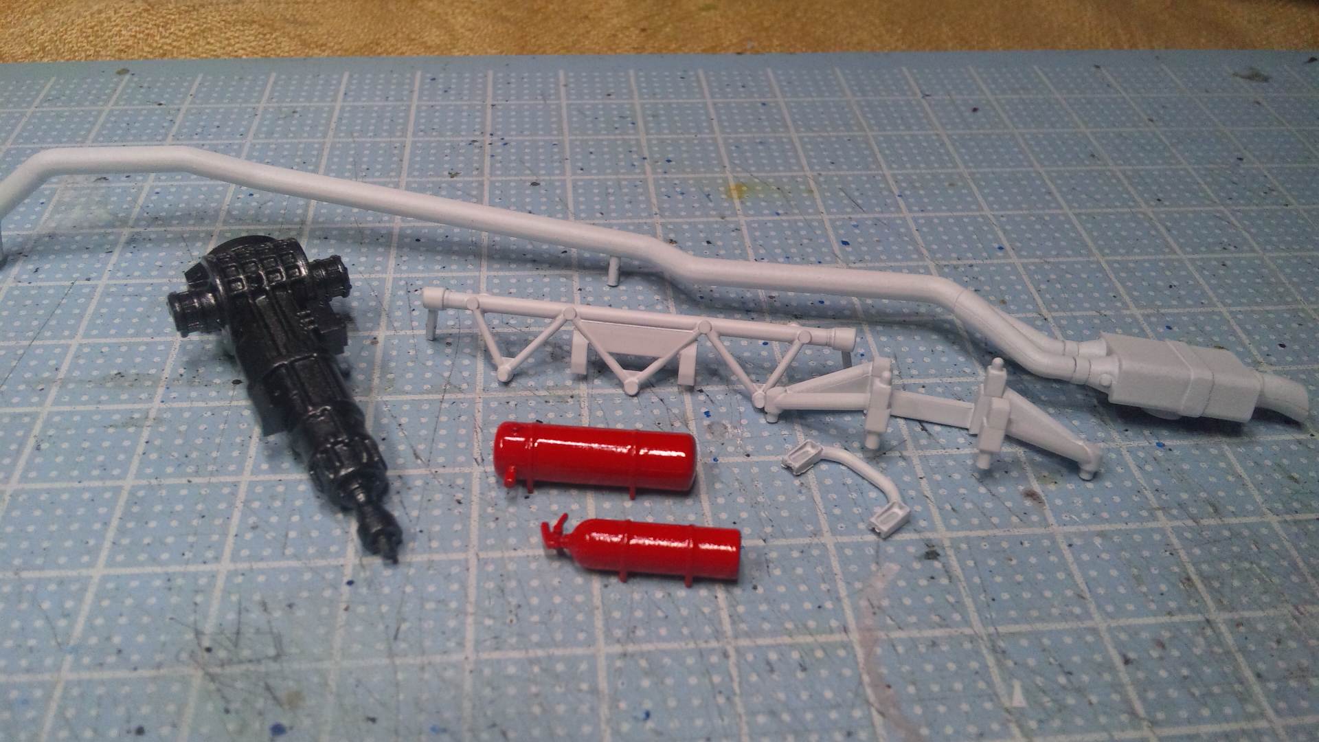 こちらは、赤と白の塗装パーツと、苦手なガンメタルを一つ塗ってみました。これで完成ではなく、部分的にシルバーや黒を塗ったり、消火器はデカールを貼り・乾燥剥離防止にクリアーを噴いてあげます。