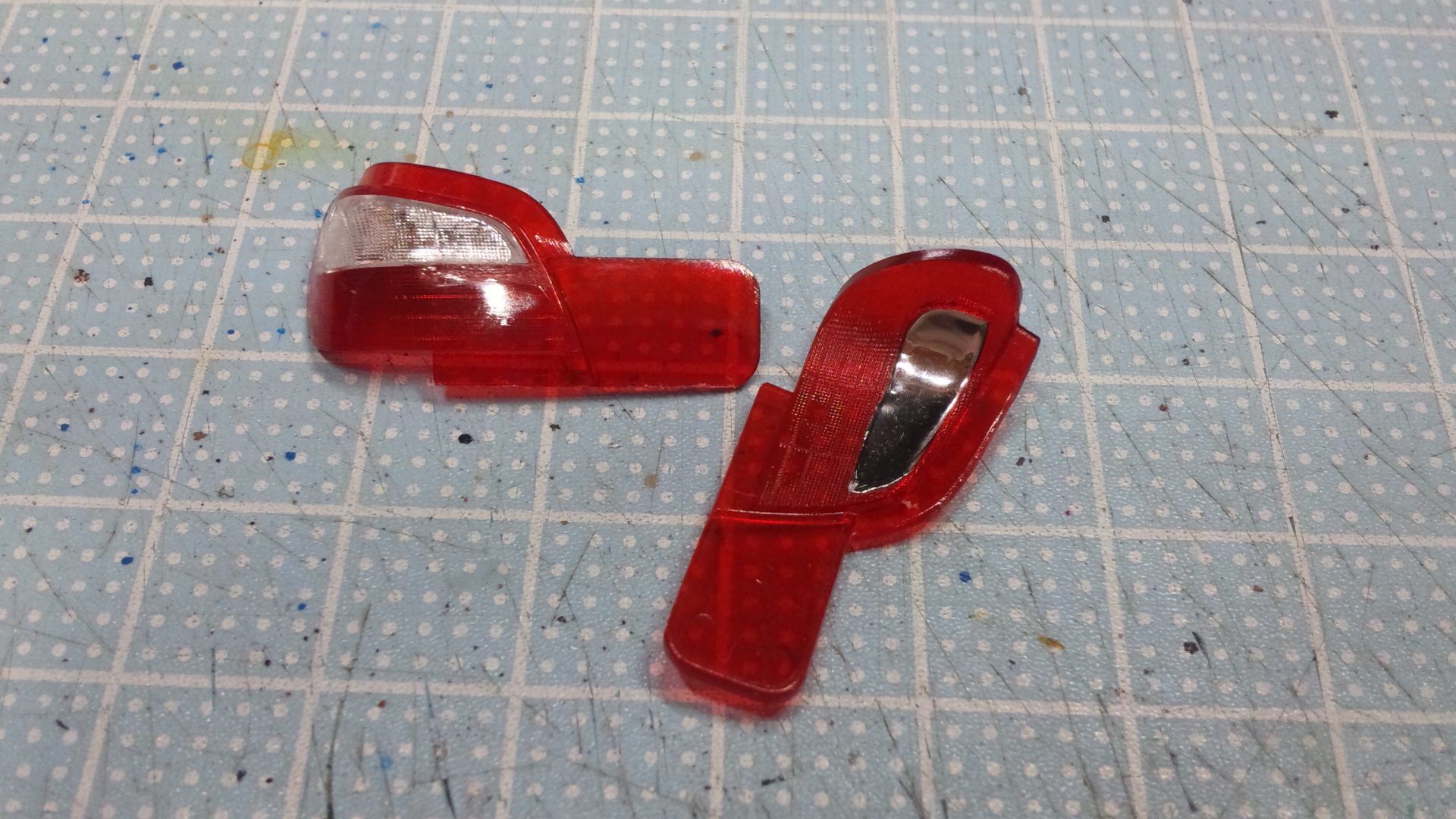 テールライト も面倒な作業を要求しています。色つきのクリアーパーツを準備してくれているのはありがたいですが、裏側から銀色のシールを貼る仕様です。シルバー塗装をしてしまえば良いのですが、初物ですし、せっかくなのでトライ。形に合わせて切出して貼るのですが、少々粘着力が弱いかも??? と思い、ミラーフィニッシュ使っちゃいました。面白い所に拘っている模型です。