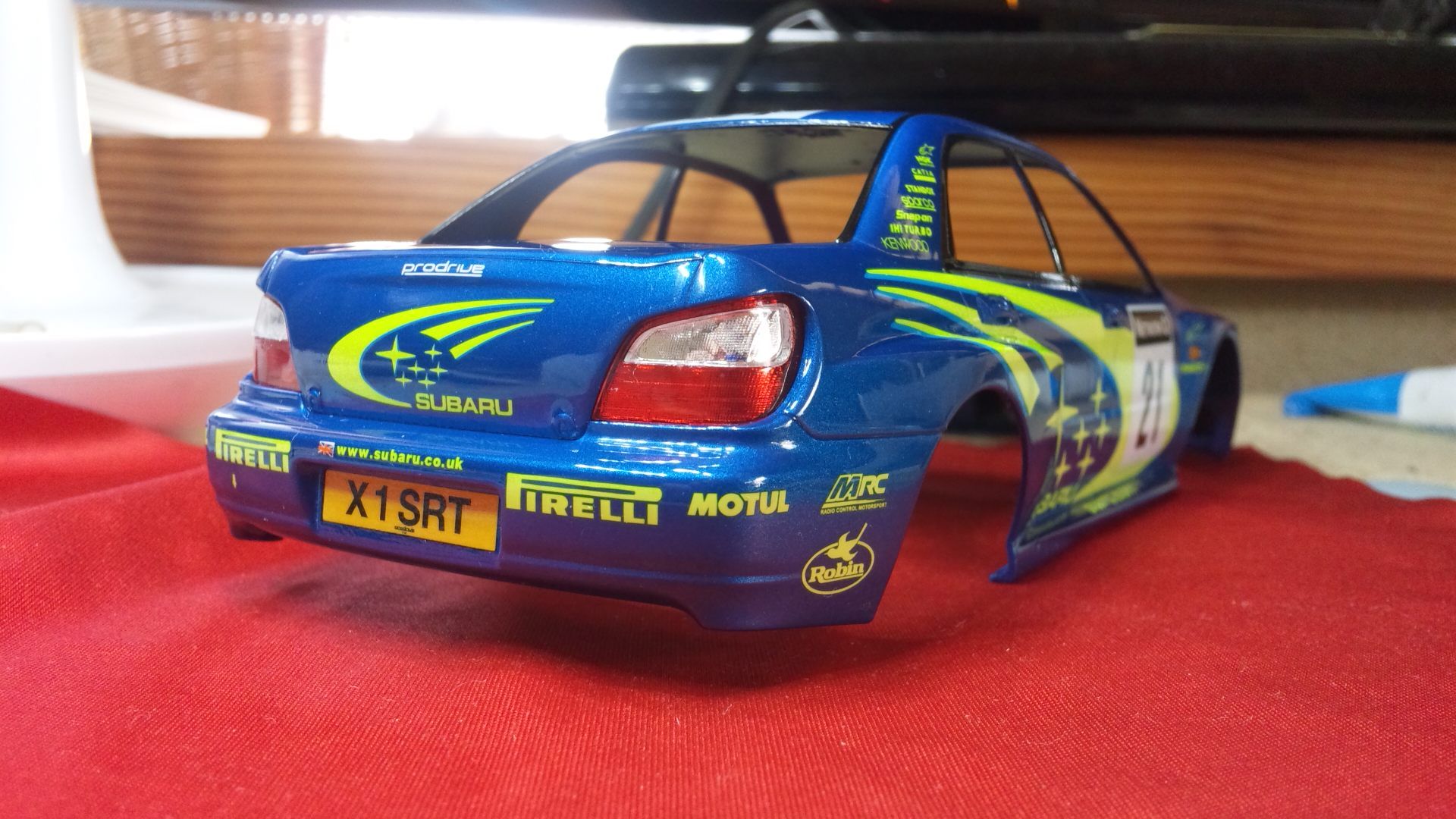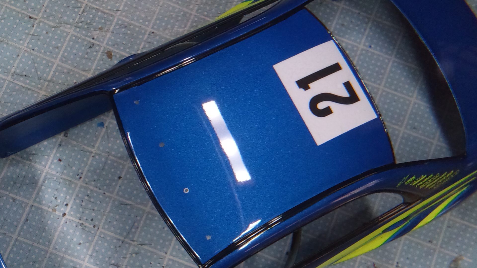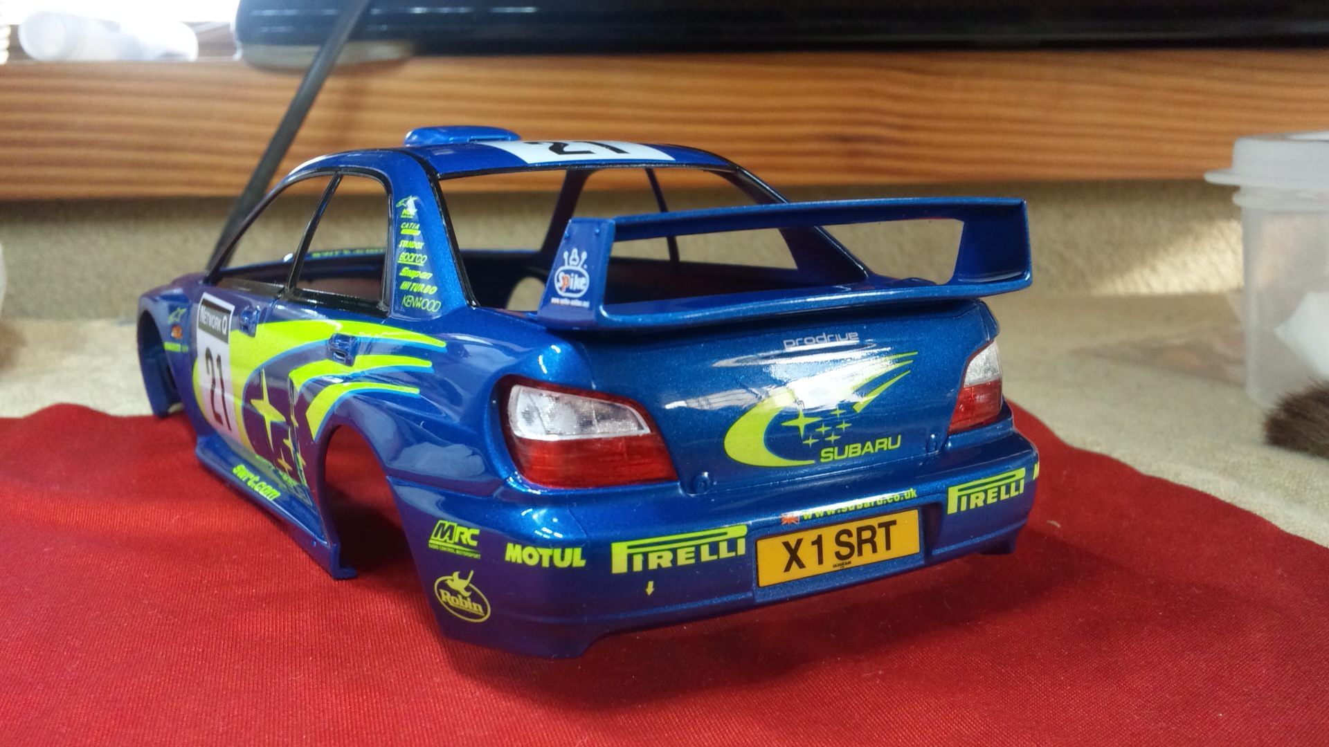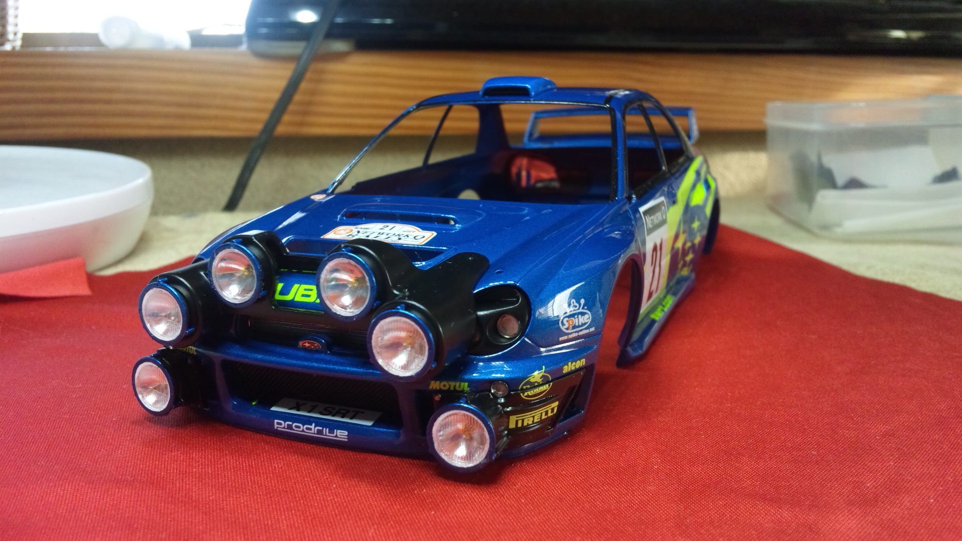 リアスポイラー も付けました。アンテナ、ドアミラーを除いてボディー表面に付けるものはすべて終了です。後は両サイドから後部にかけて、ラリーカーらしく汚れをエアーブラシすれば組み立てて終わりにできます。年内完成の目途がたち、一安心です。