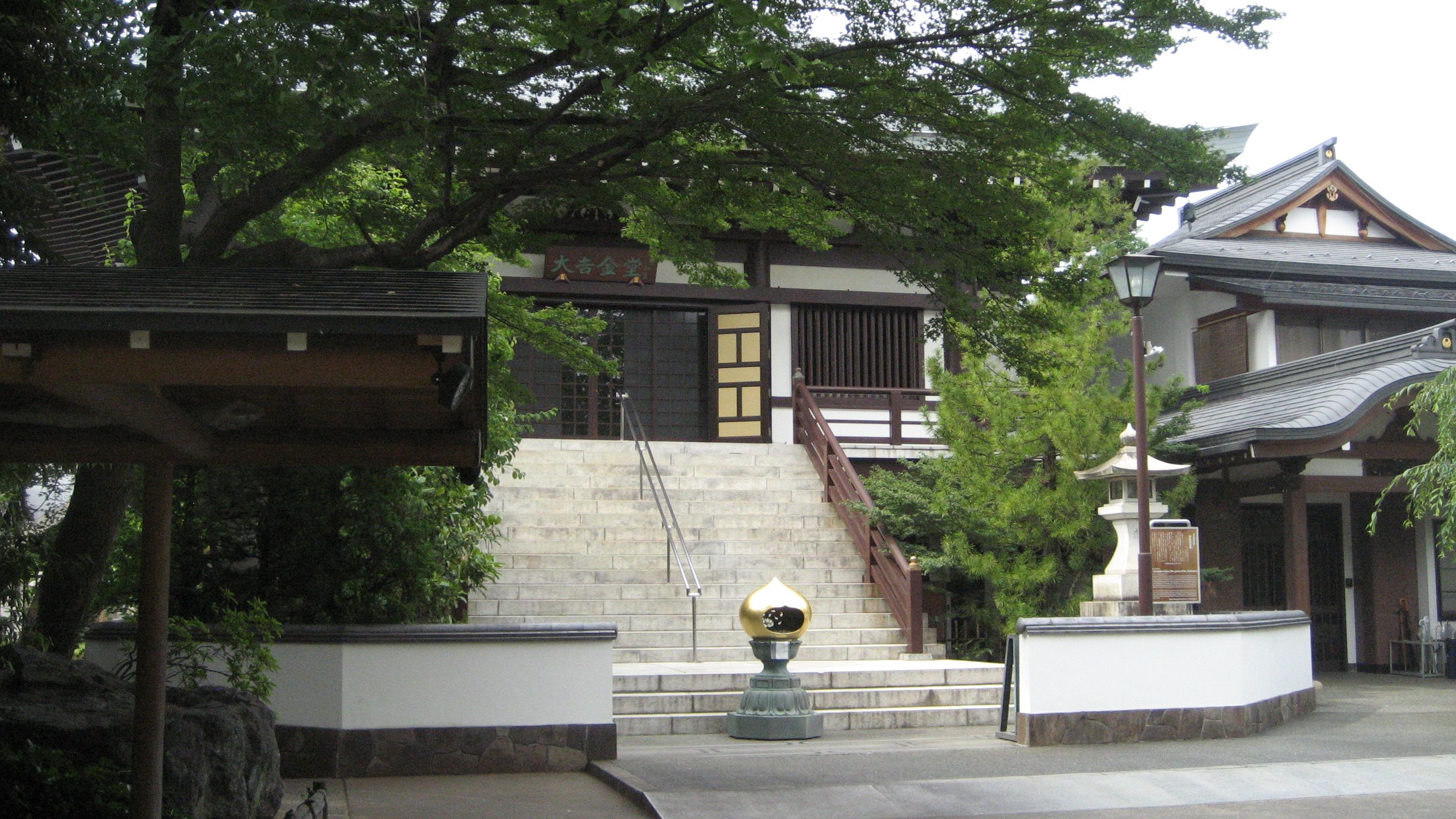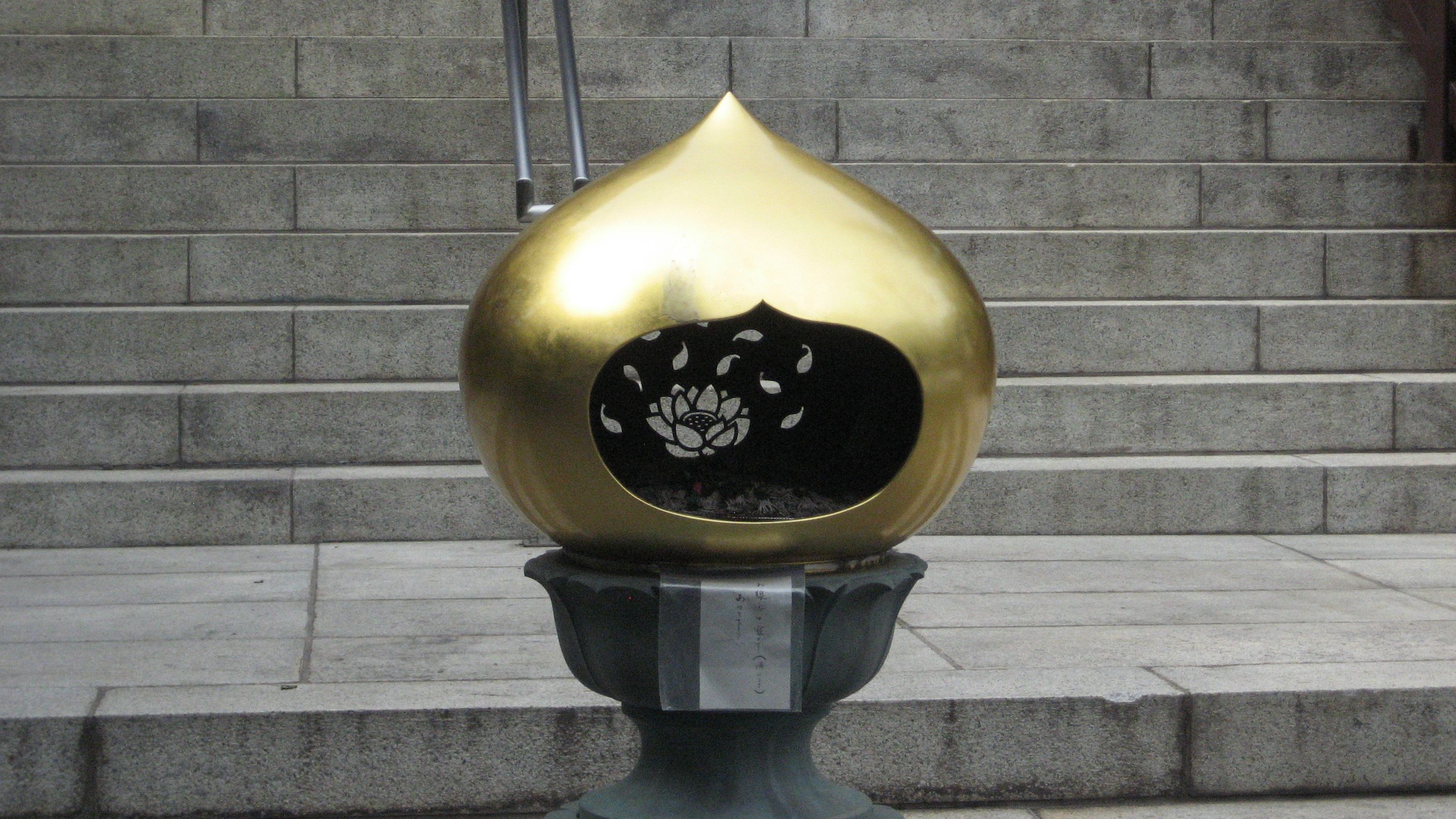 本堂階段下の金色の桃は何かと言えば、お線香炊くところでした。お線香は寝かせて置くように指示がありました。後方に切り抜かれているのは蓮の花でしょうか? 師匠の切り絵を思い浮かべちゃいました。メッキでしょうが高価そうです。