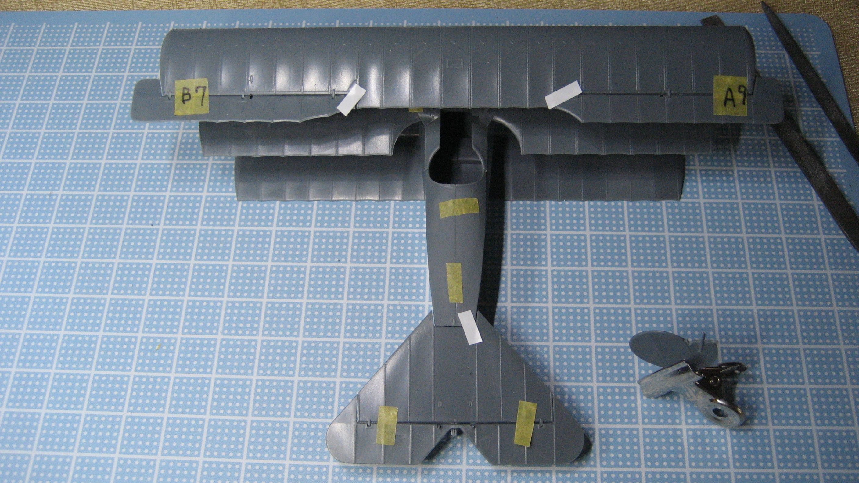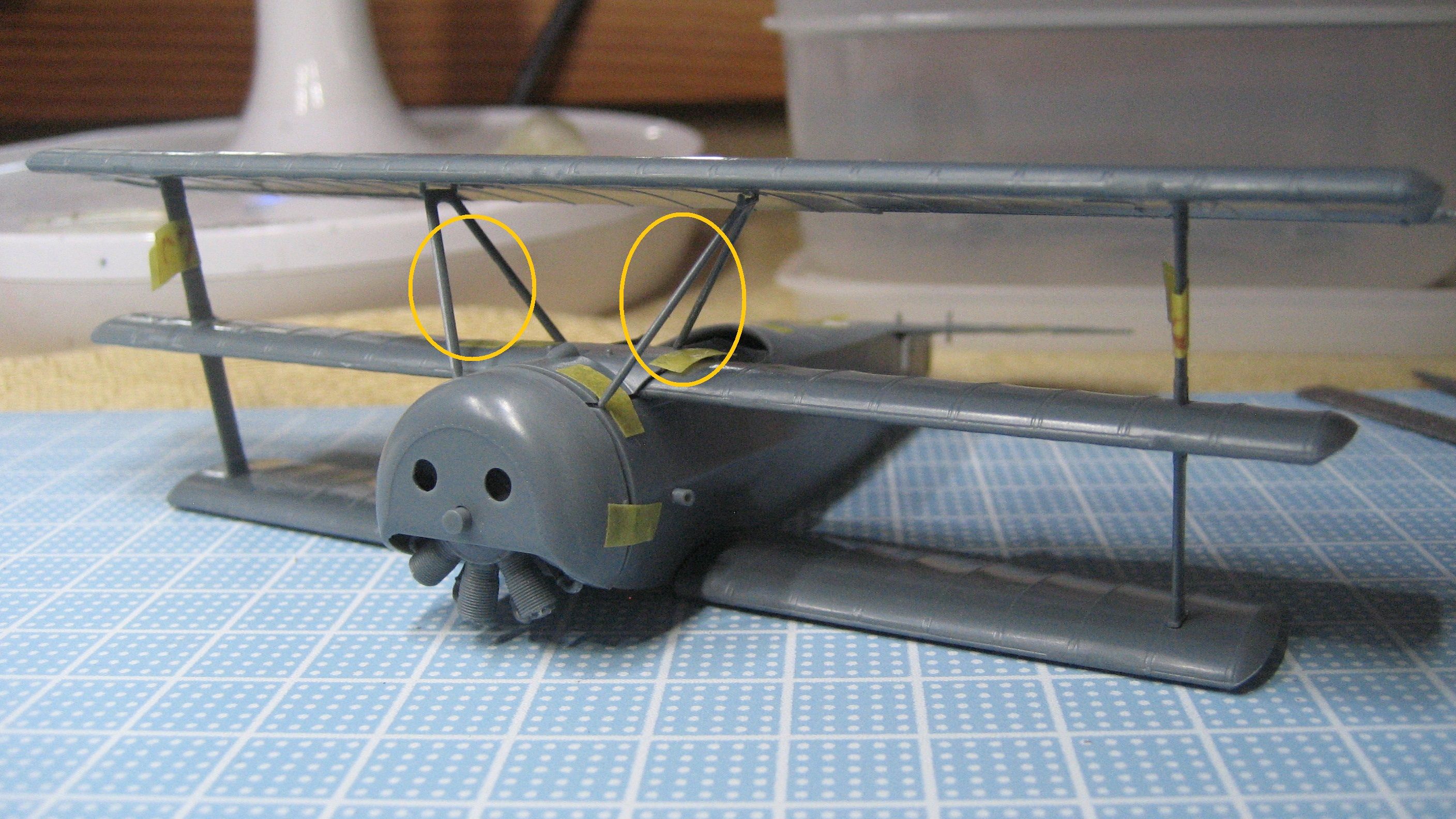 パッケージの絵をよく見たらこれまたビックリ。主翼や車輪ベースなどもワイヤーで引っ張って補強してありました。やっぱり実機を知らないとダメなんですね~ 知ったからと言ってもはてさて最後にワイヤーもどきの釣り糸が張れるかしら???  極々短かったり、第一主翼と第二主翼の間なんかどうやって張るの??? 瞬間接着剤は本当に不慣れな私です。