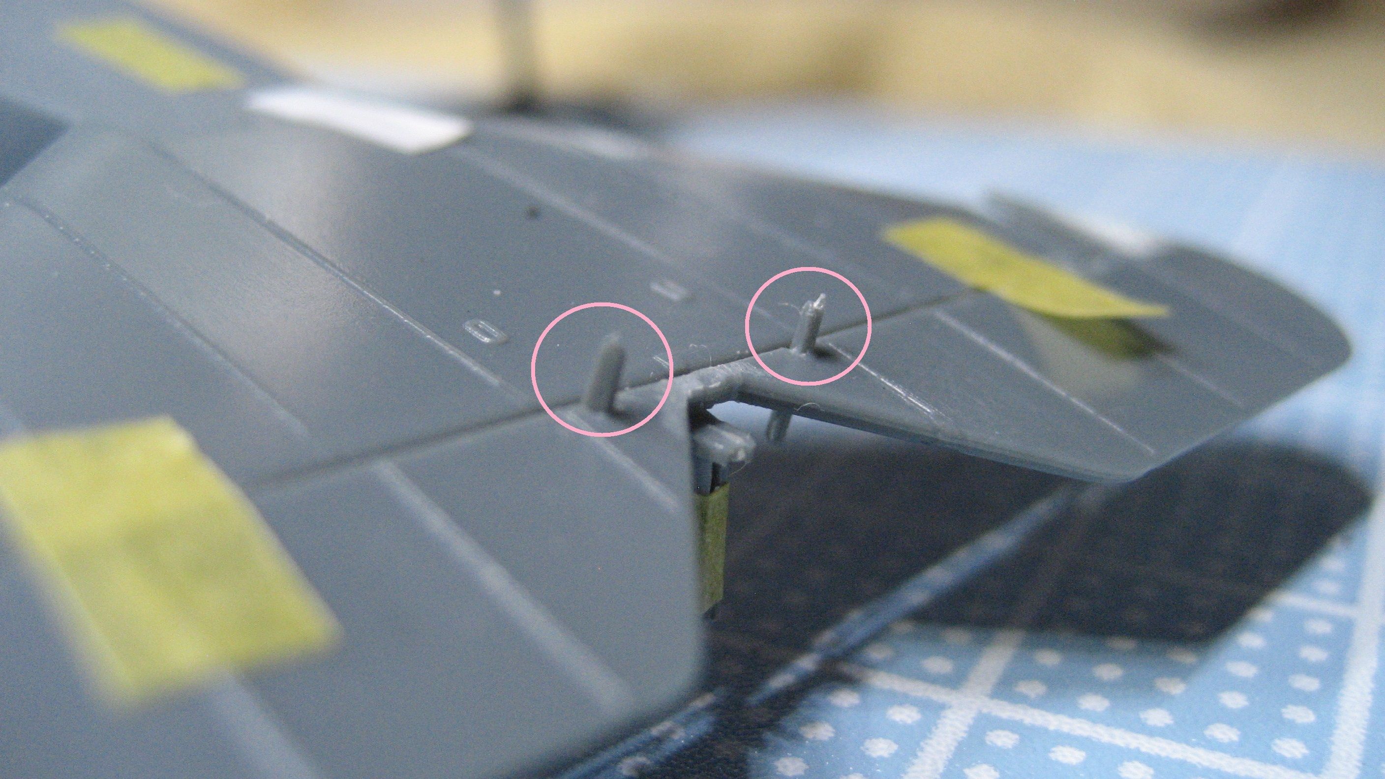 尾翼フラップにピンク〇 こんな出っ張りパーツを付けるよう指示がありました。色は違うのですが小さいし後で上から塗れば良いや~ と訳も分からず接着してみたのですが、いろいろ調べてみたら操舵と言うのか? フラップの昇降はワイヤーでやるみたい。従って釣り糸か何かを張るみたいです。説明書にはそんなことまで書いてないじゃないの……主翼のフラップも同じようにせなあかんみたいです。