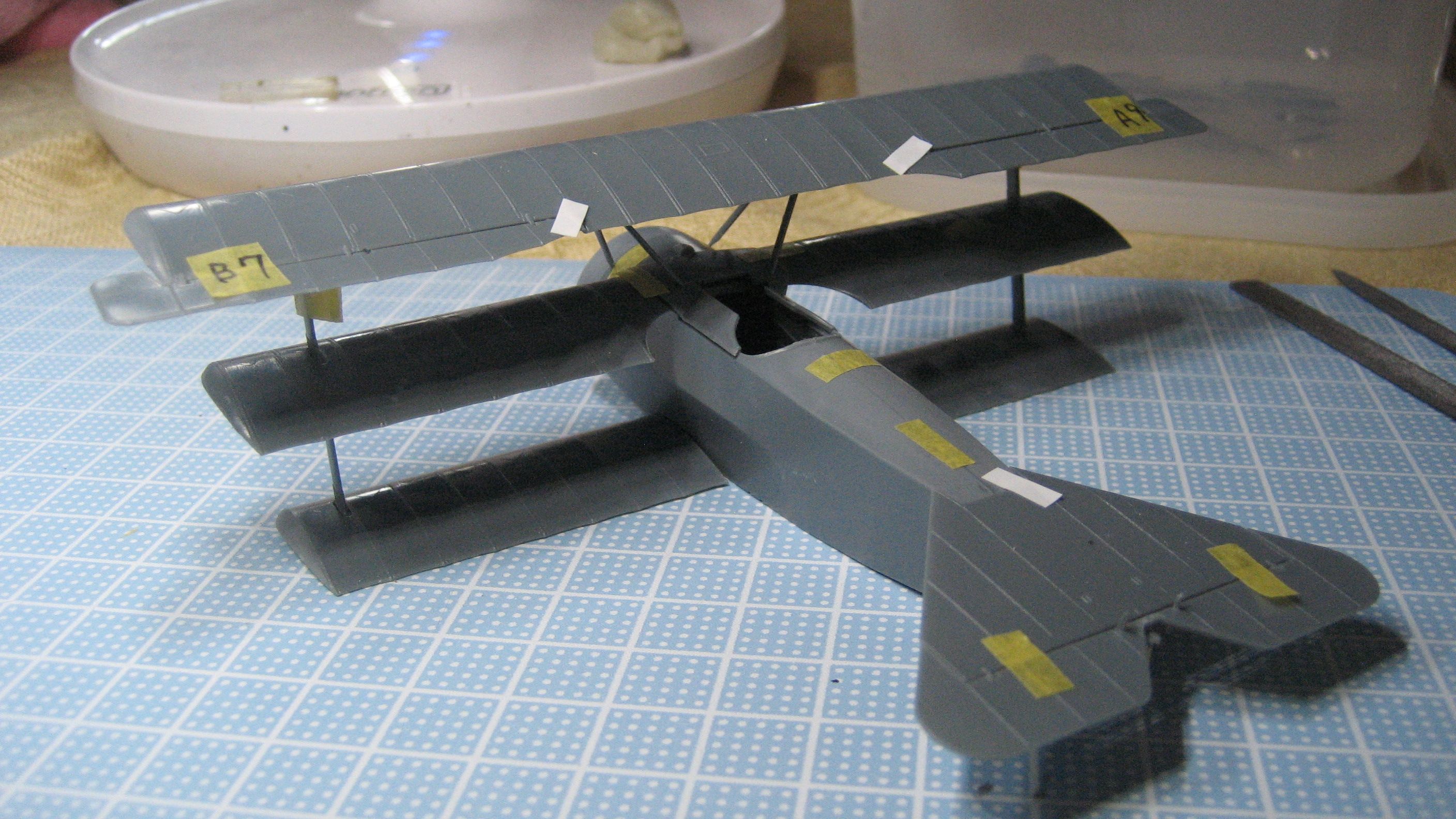 機体全長10cm、最大主翼幅15cmの小さいやつなので、屋外作業のエアーブラシではたして細かな迷彩塗ができるかしら??? 「あぁ~室内塗装部屋が欲しいよ~」と贅沢な思い……筆塗りにしようかな??? でもな~ ……などと、こんな作業をしながら考えています。