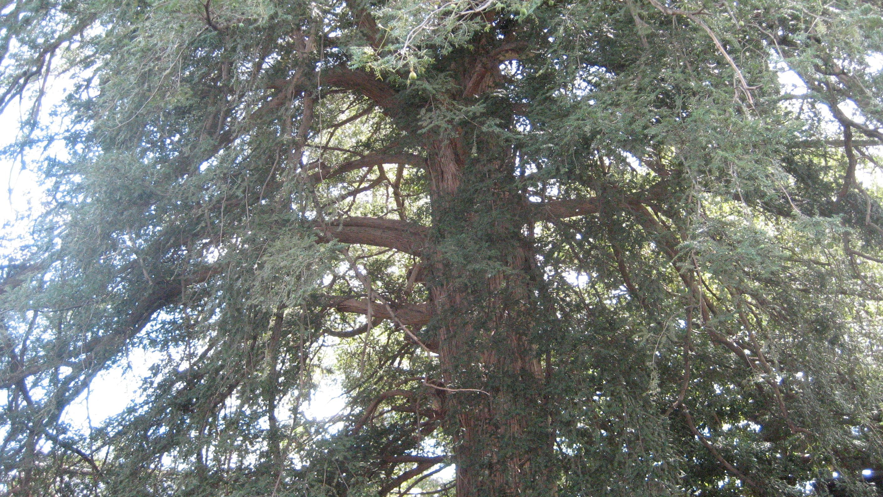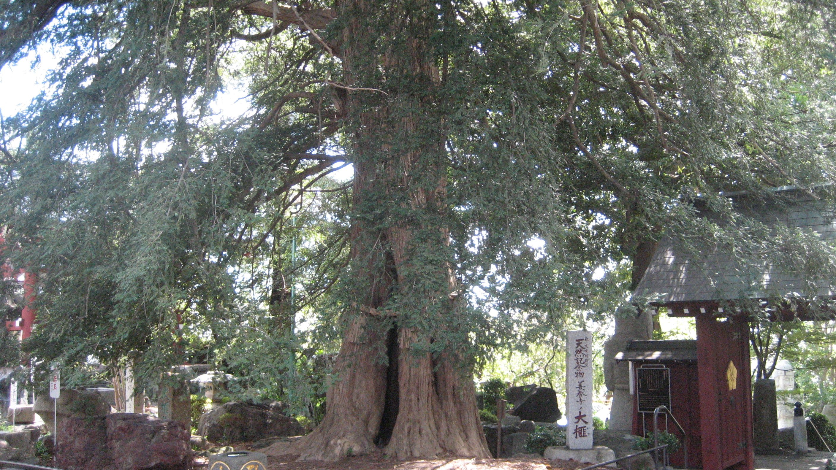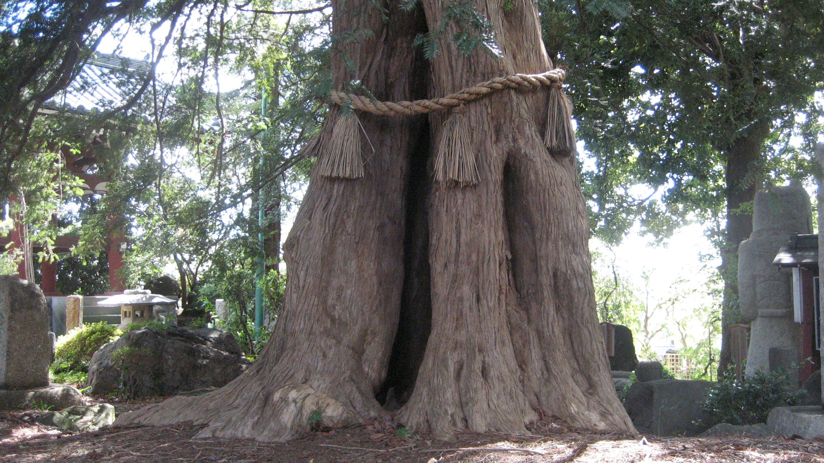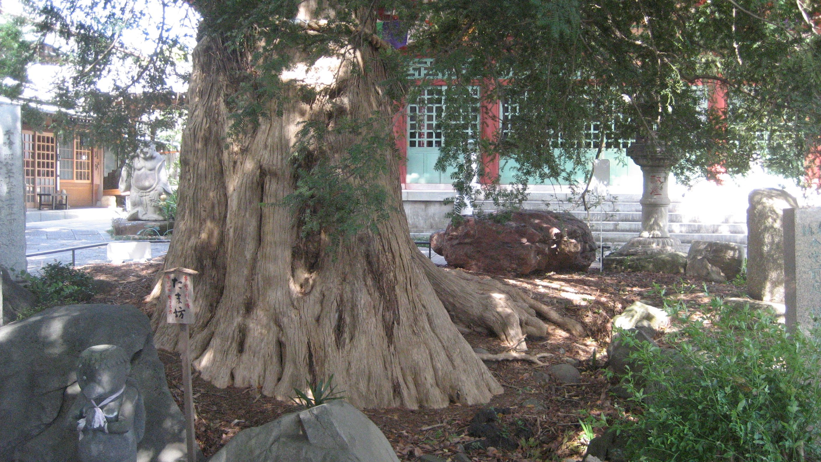 天然記念物・大榧(かや)……なるほどデカイ……高さ約18m、幹周囲約6mだそうです。 石には[善養寺ノ大榧]と掘られていました。『密』の要否が分かりません。