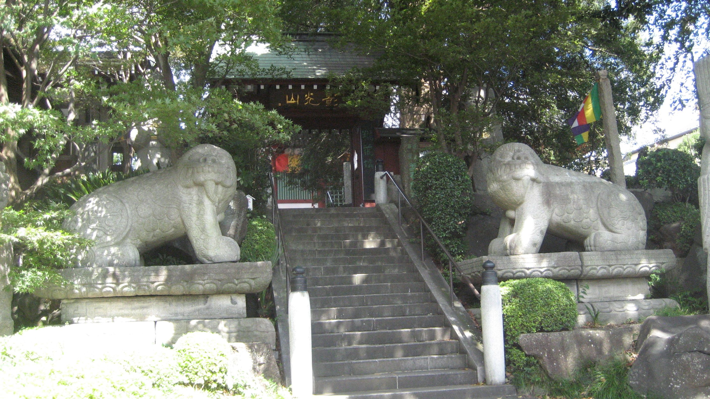 山門前の石段……狛犬とはちょっと違います。[海駝](かいだ)と読むのでしょうか? 架空の生きものみたいですが、何が登場するかわからない寺です。