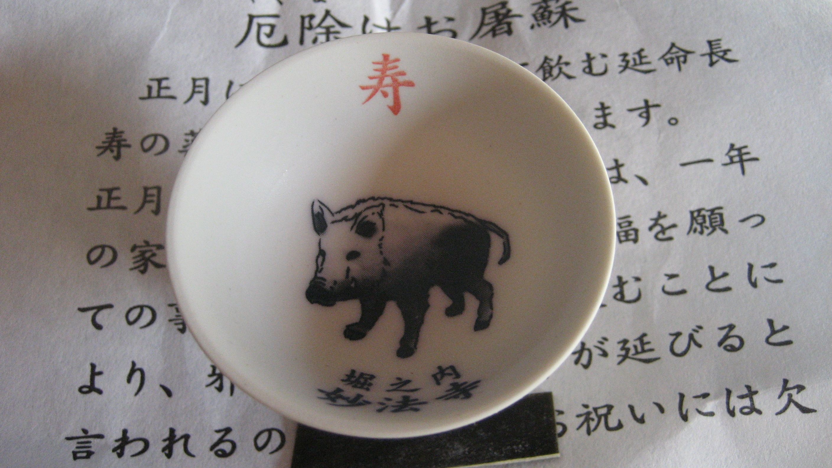 ​  本堂(三軌堂) でお屠蘇を頂戴し、お土産にもらいました。もう、十二支の盃は集まったかもしれません。​例年10時開始のはずなのですが、今日は10時前から並ばずにあずかれました……ありがとうございました。