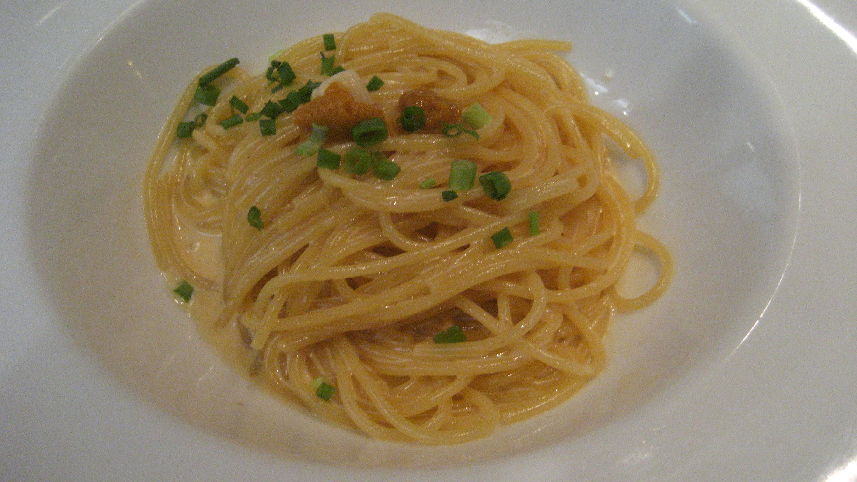 ​ 雲丹クリームパスタ ……半分ずつに分けてくれるのがありがたいです。小さい貝柱が、私の皿には1つ、連れ合いの皿には3粒あったようです。連れ合いが満足してくれれば、それで私は充分です。​