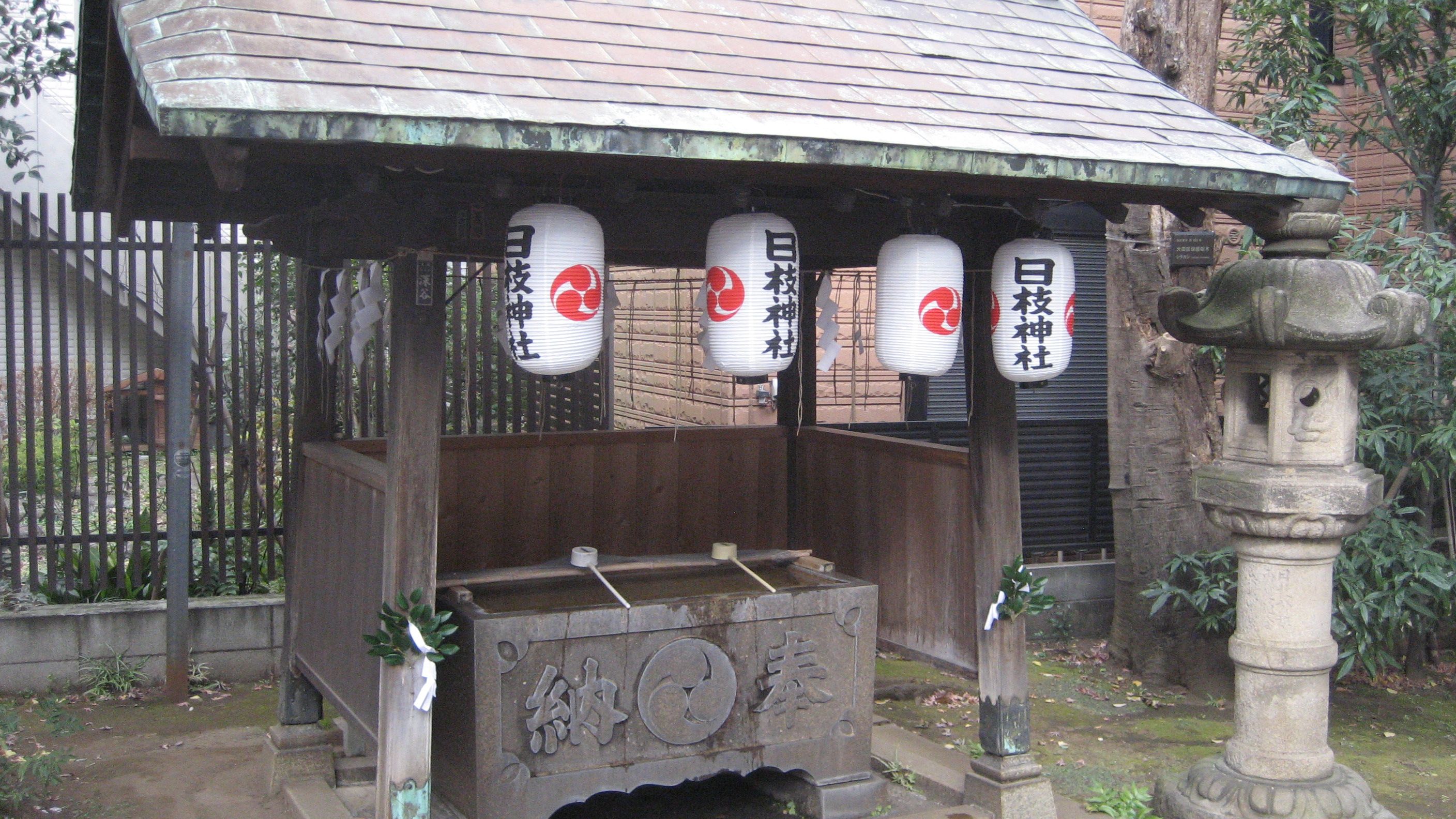 ​  手水舎 ……正月のなごり? 真新しい提灯…​