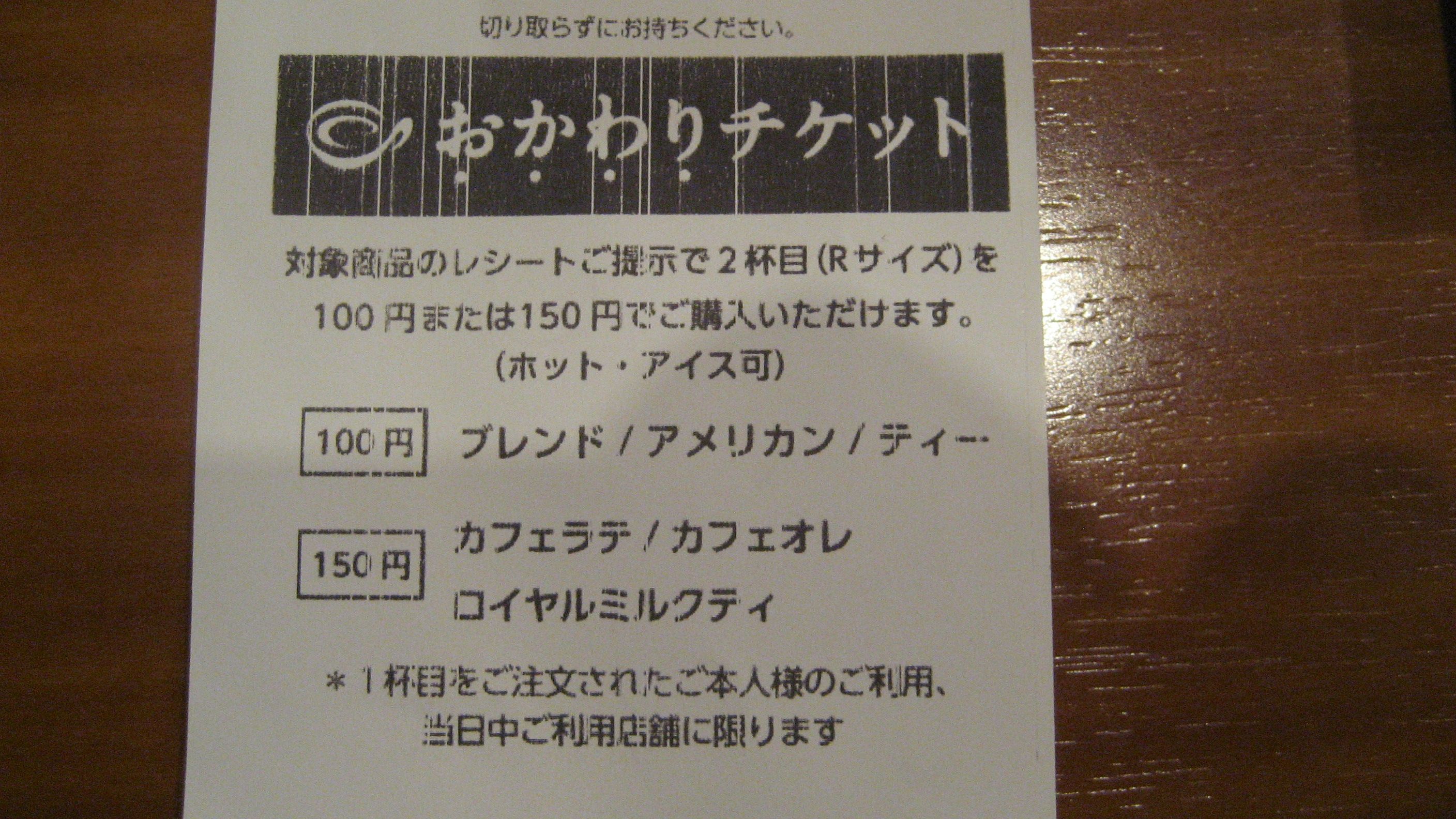 レシート下方にありました。2杯目は100円ですって……ありがたいですね。早く近くに出来てくれないかしら?
