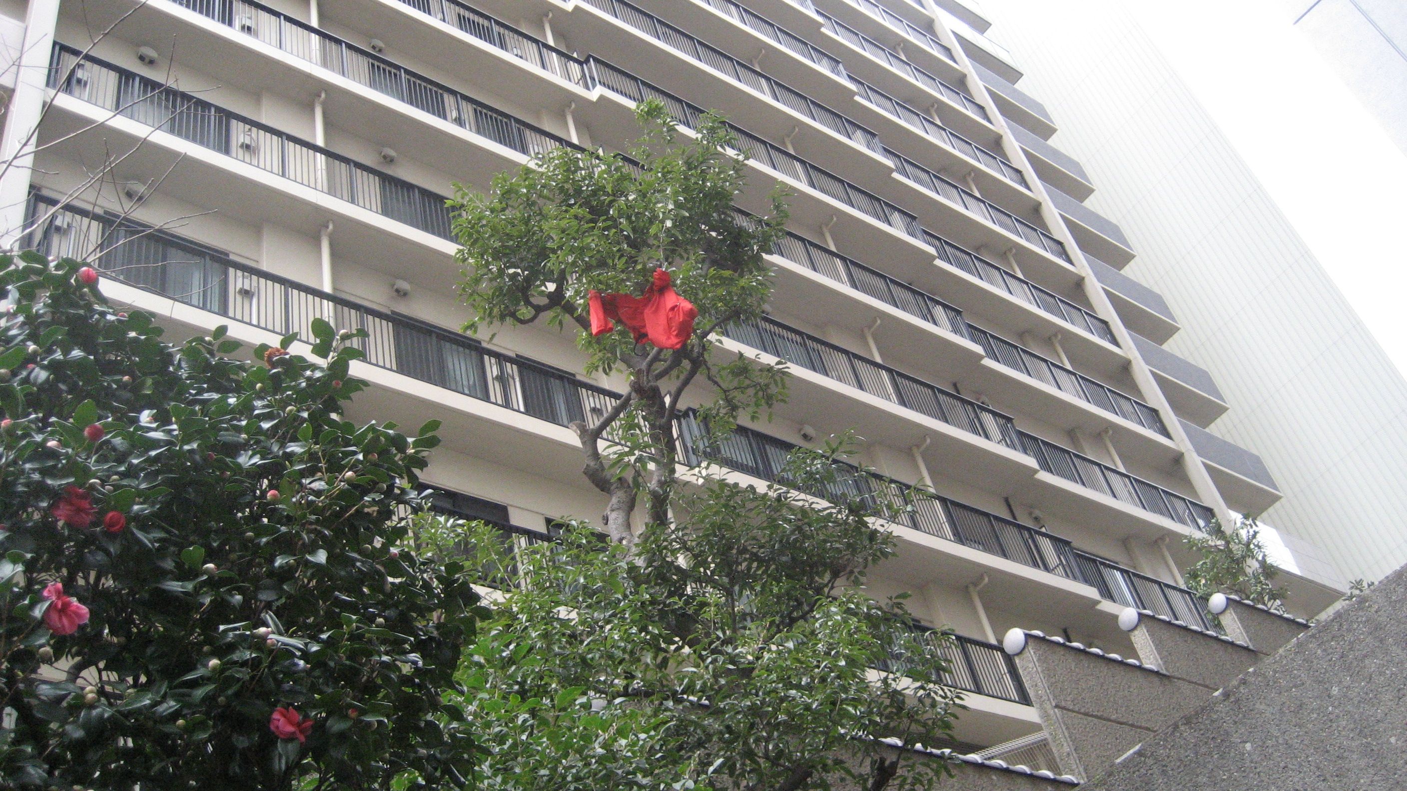 しょうがないから、階段を上り始めると衣類らしきが木に引っ掛かっています。高層マンションのベランダから飛んできたのでしょうね。