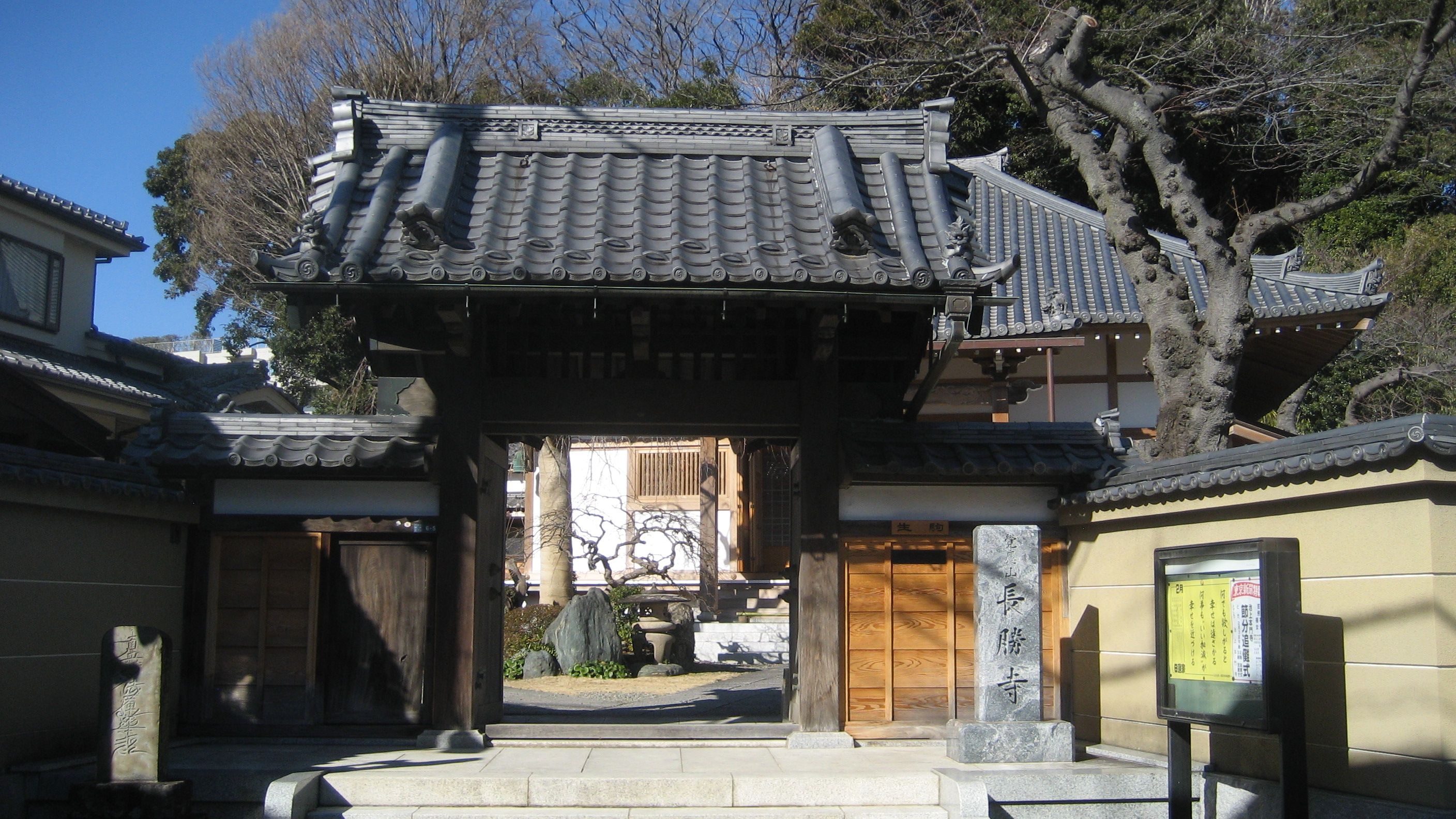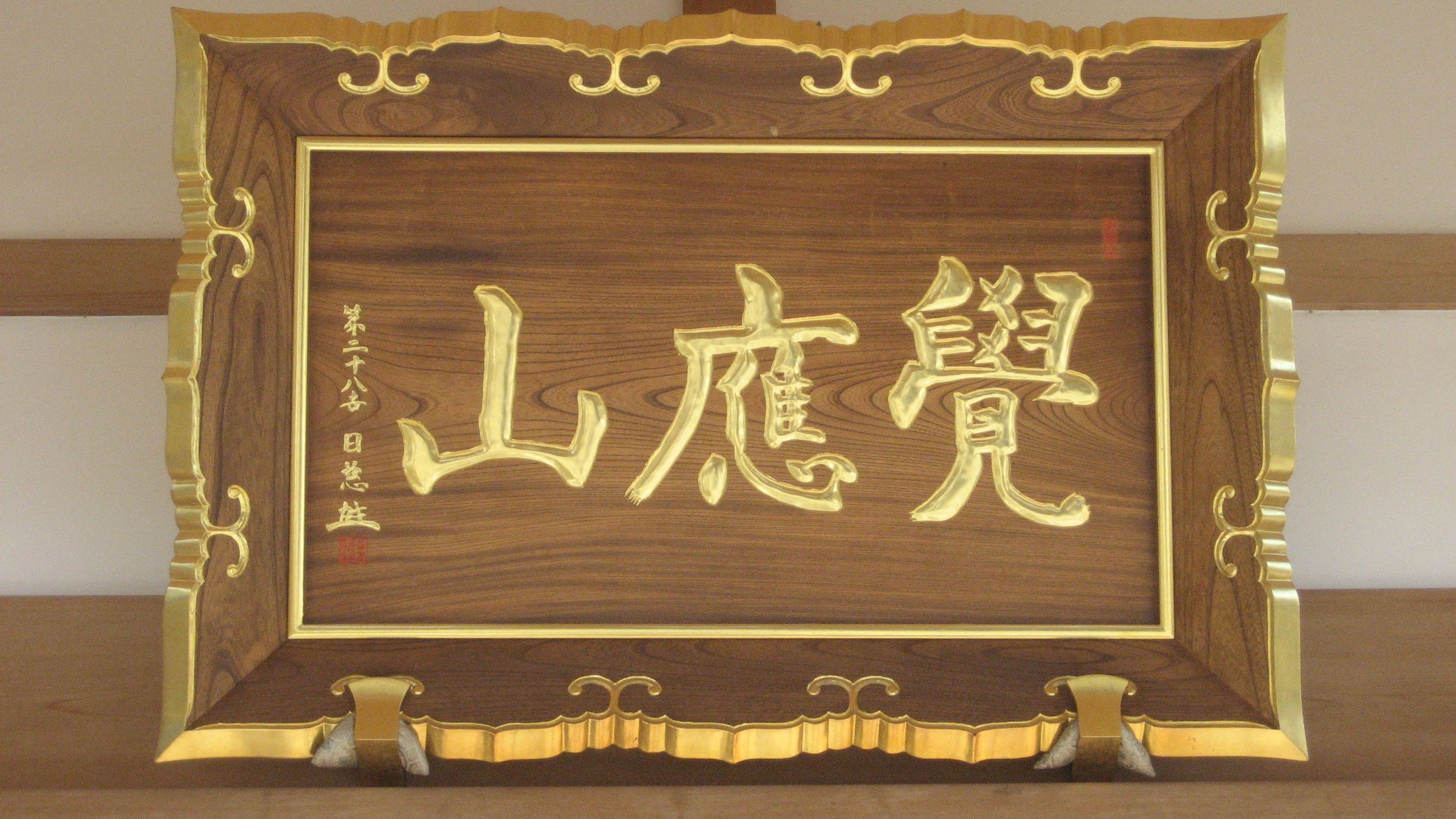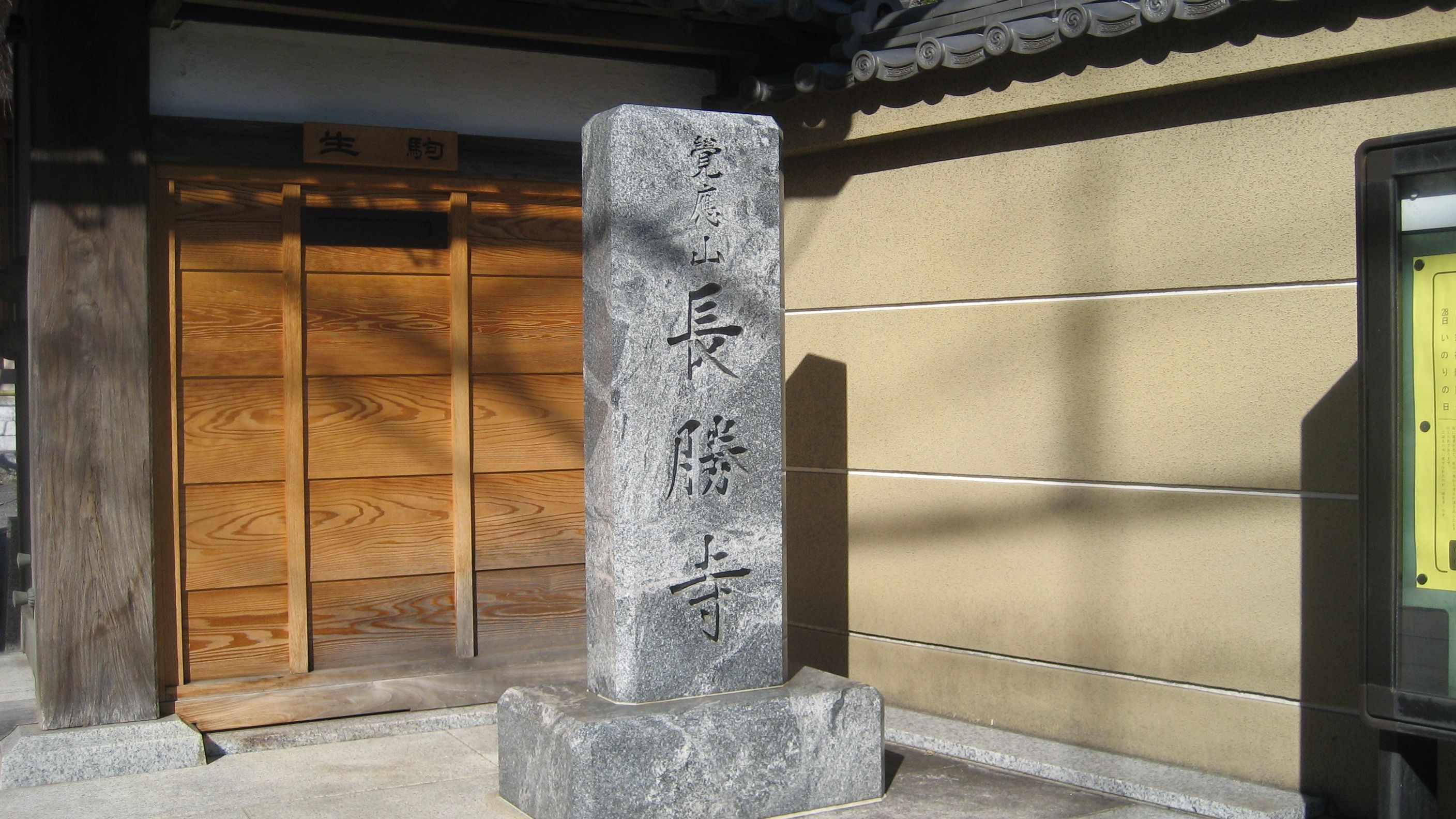 ​  ​本​ 堂の扁額​ ……覚應山 長勝寺​……密集した子院からは少し離れますが日蓮宗のお寺です。
