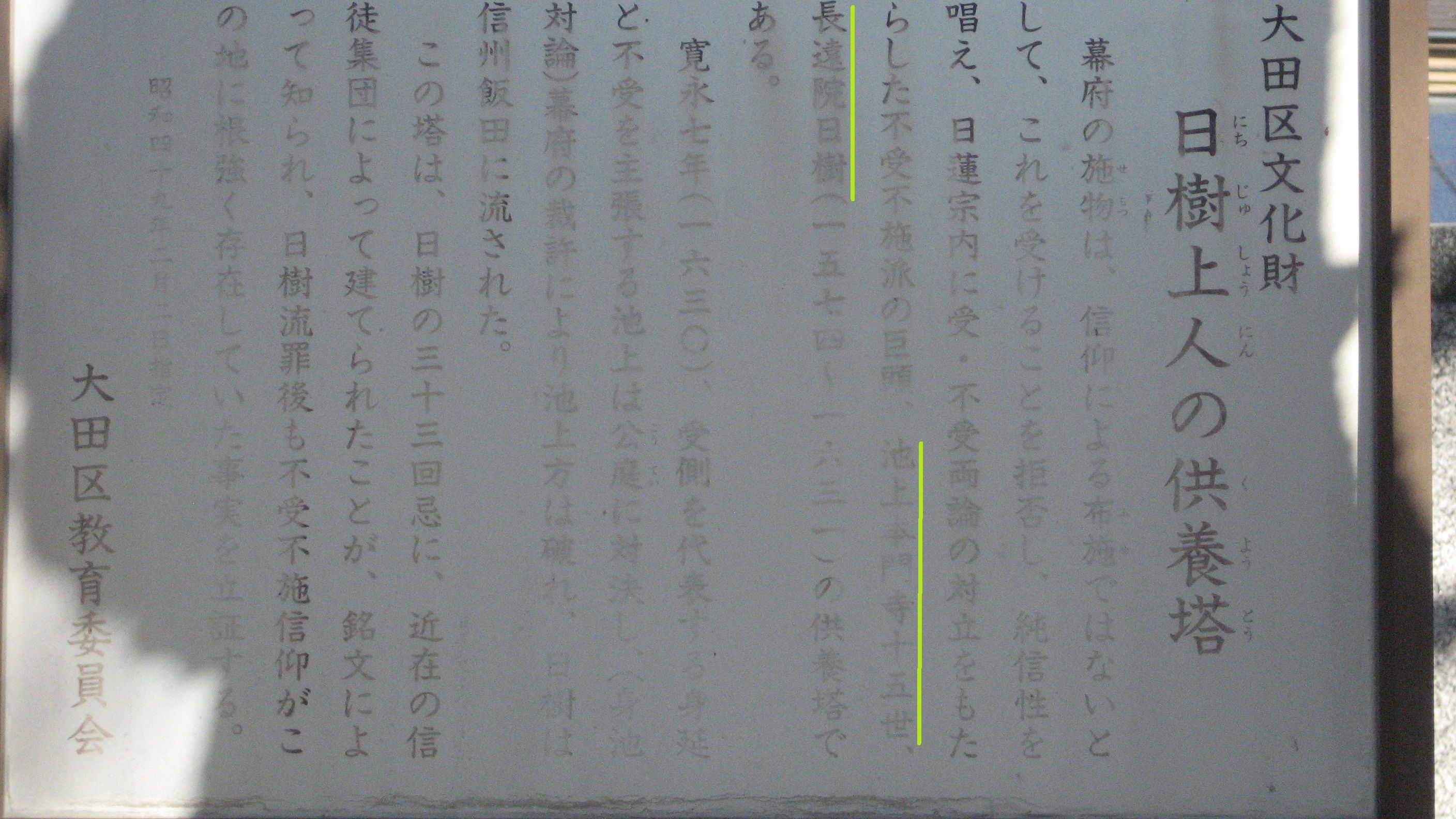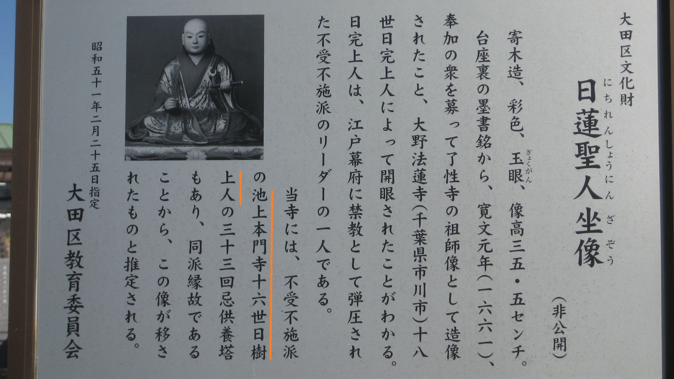 江戸幕府によって弾圧された不受不施派のリーダーの一人・大野法蓮寺(千葉県市川市)18世日完上人によって開眼された「日蓮聖人坐像(非公開)」がおさめられており、大田区文化財と書かれていました。