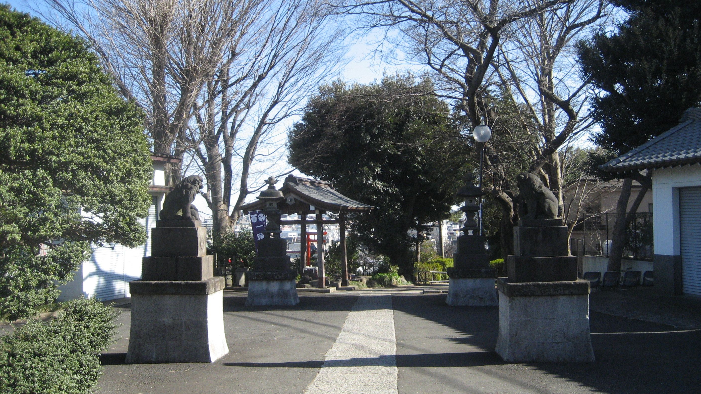 ​ 狛犬と拝殿 ……​主祭神は誉田別命。近隣の[竃神社(かまど、と読むのかしら?)][稲荷神社][貴船神社]を合祀したそうです。明治のことなのでしょう……
