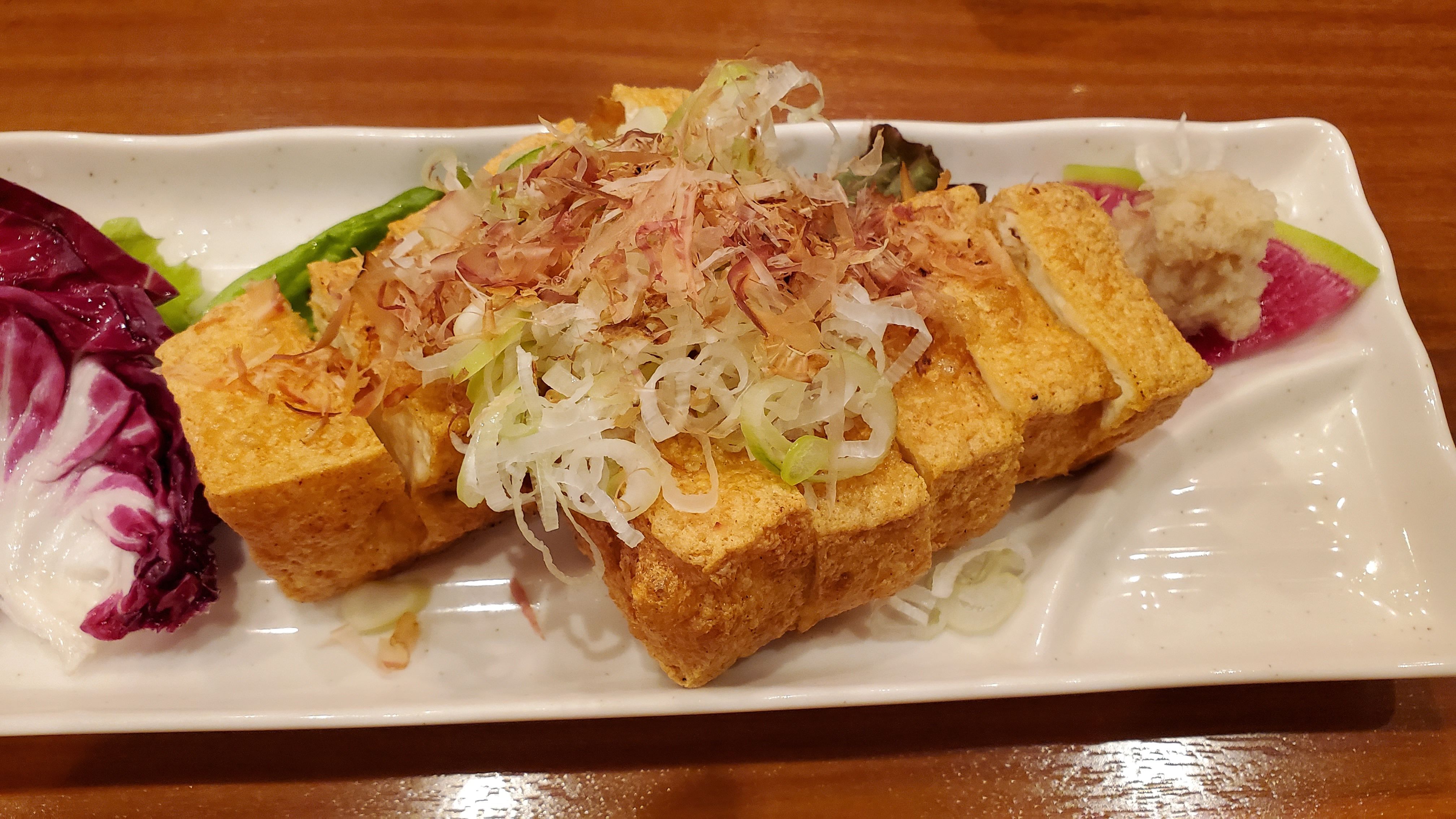 傘だけ引きとって帰ろうと思っていたのですが、久々にA先生の顔があったりしたので自家製厚揚げでチョコっと飲むことに。 A先生は、宮崎の居酒屋で2か月間英語を教えてきたとのこと。お疲れさまでした。