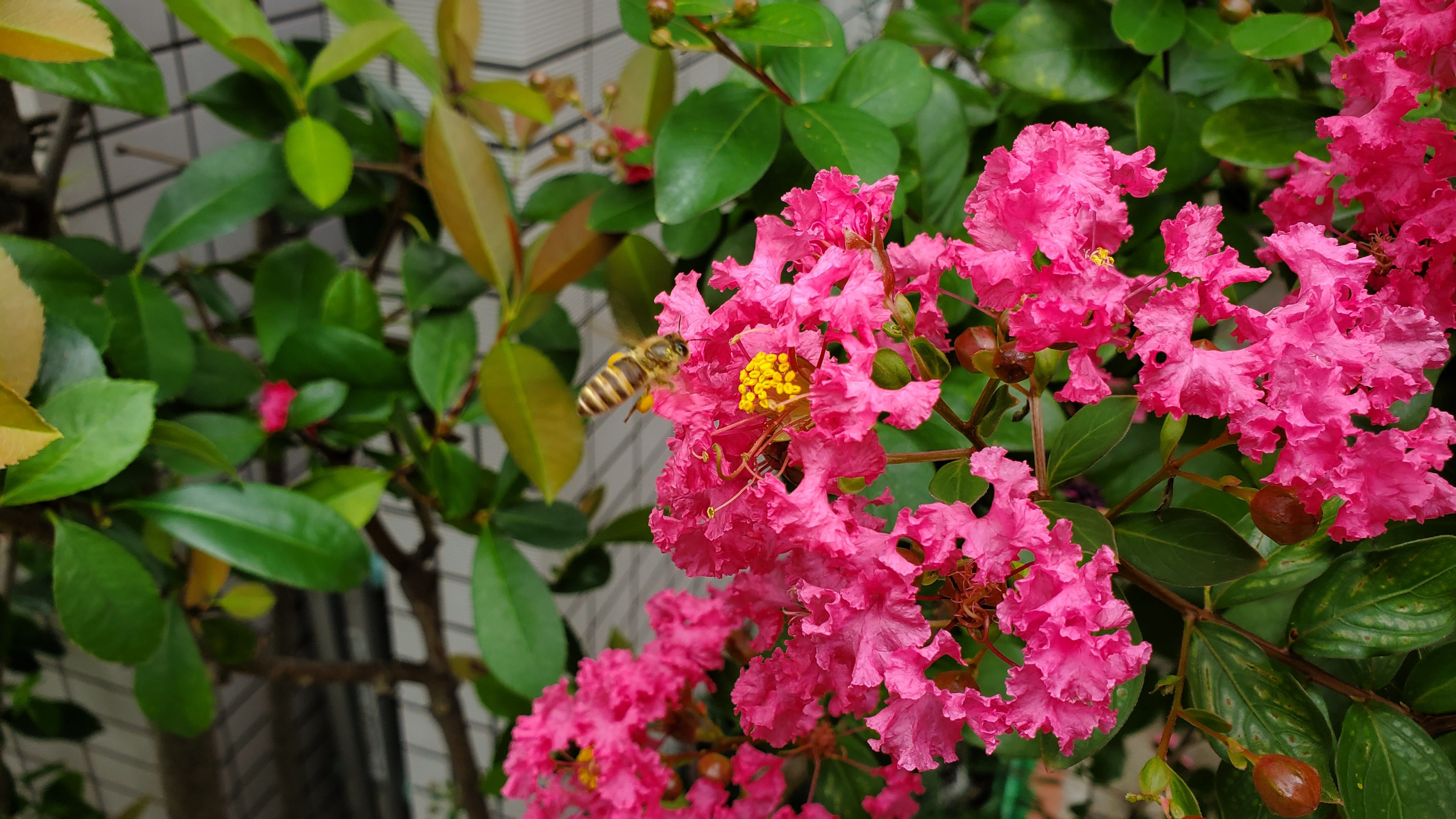 ミツバチでしょうか? 1匹 上下左右に飛び回っていました。追いかけて撮るのに一苦労……でも、なんとかGet!!! シメシメ…