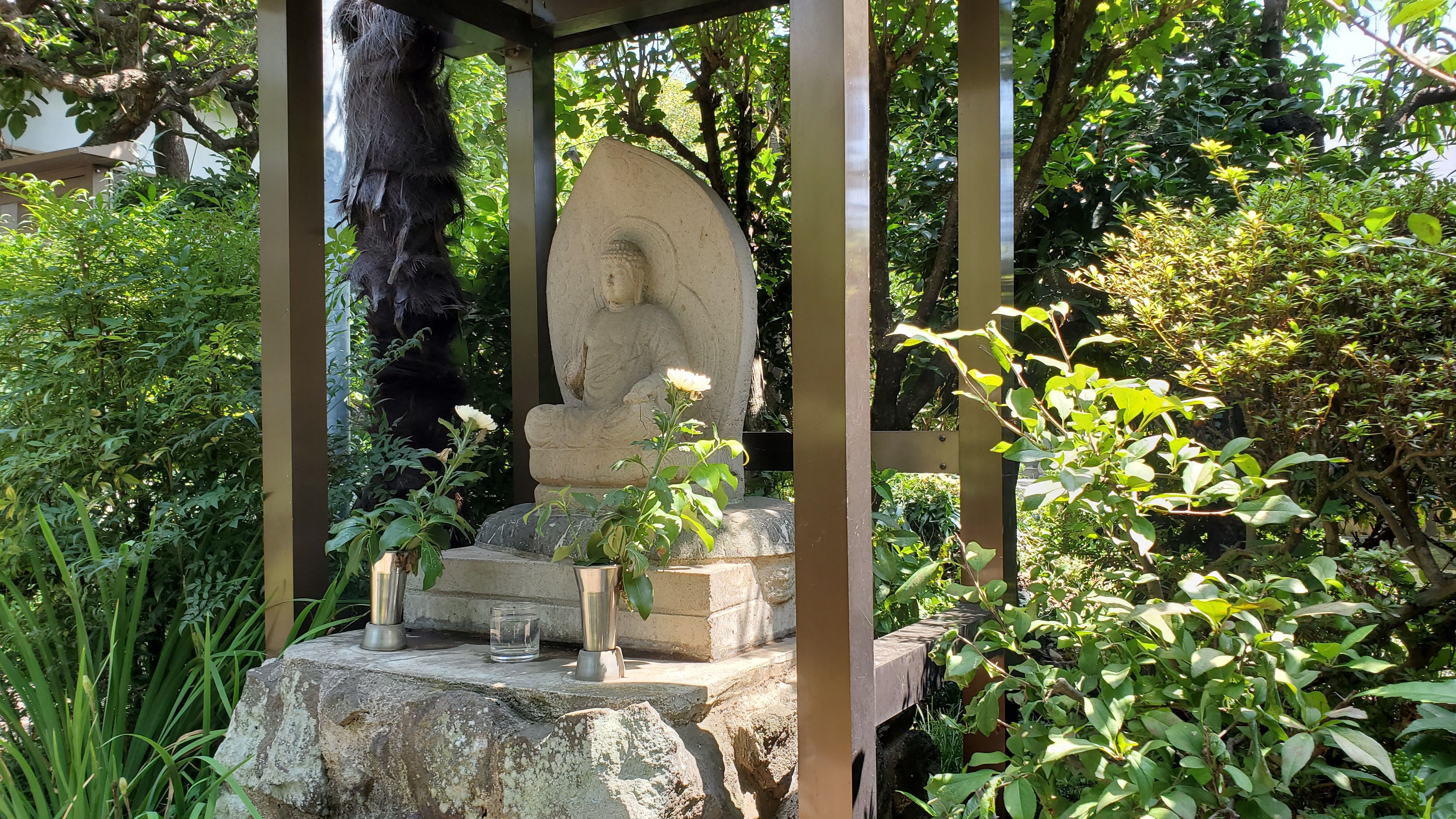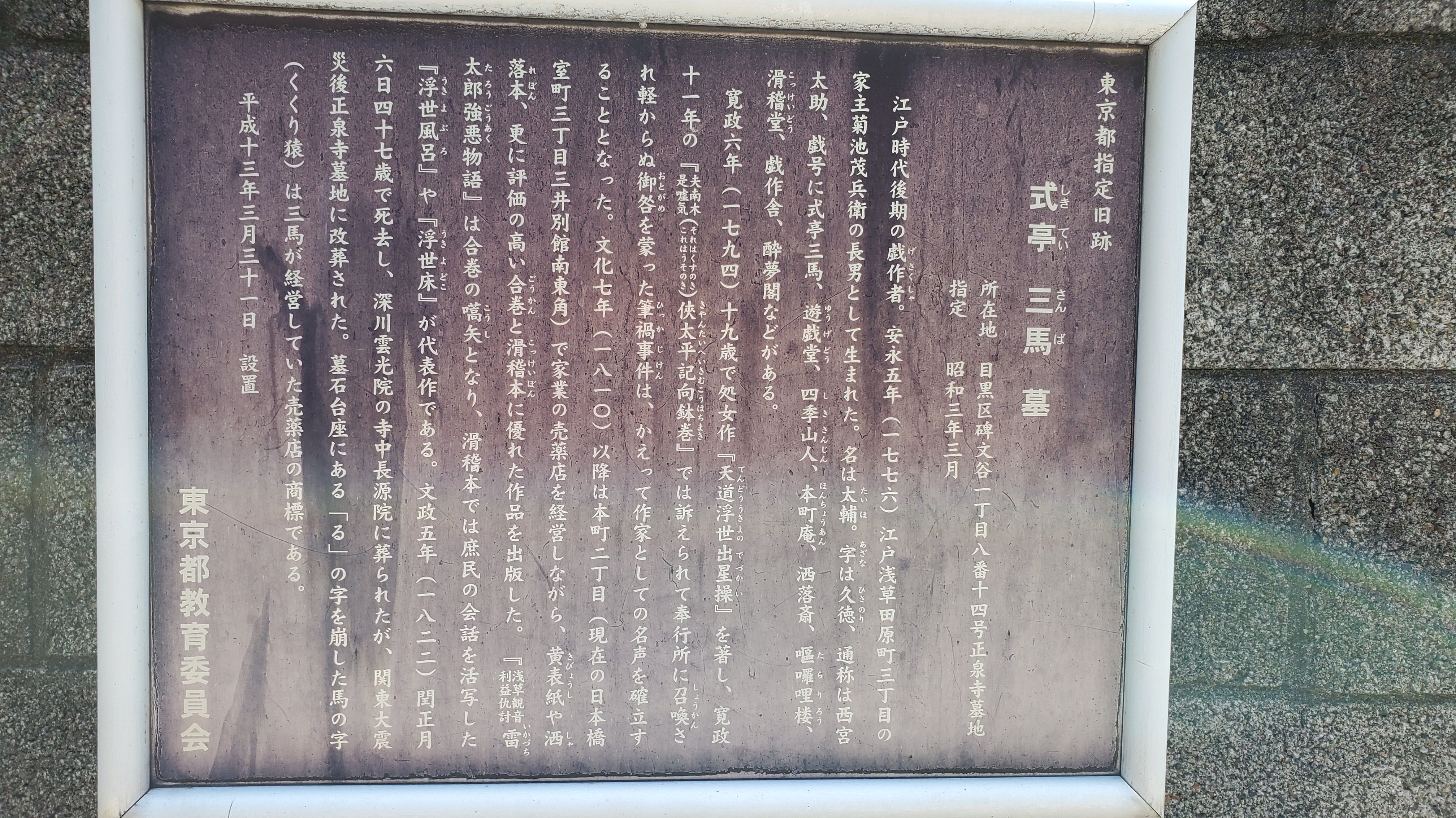 ちなみに、式亭三馬(しきていさんば)とは江戸時代後期の戯作者(げさくしゃ)で、「浮世風呂」「浮世床」「古今百馬鹿」などが代表作だそうです。文政5年(1822年)47歳で亡くなり、深川雲光院の寺中長源院に葬られたが、関東大震災後に当寺墓地に改装された。墓石台座にある「る」の文字を崩した馬の字(くくり猿)は三馬が経営していた売薬店の商標である。と(東京都教育委員会の掲示)にありました。今度、「る」の字を求めて再チャレンジしてみましょうかしら?