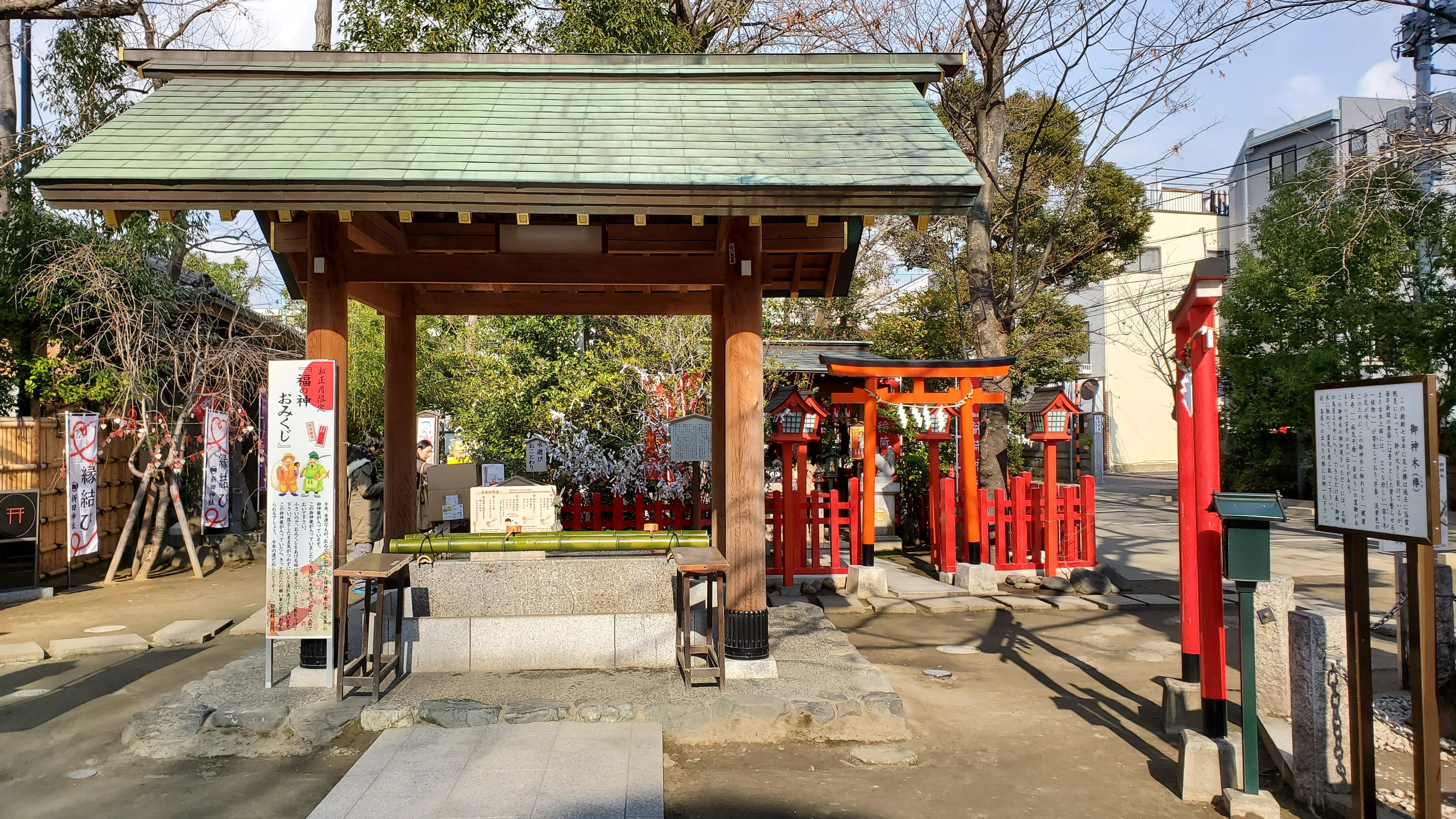 手水舎の後方に稲荷神社……朱色がまぶしい!