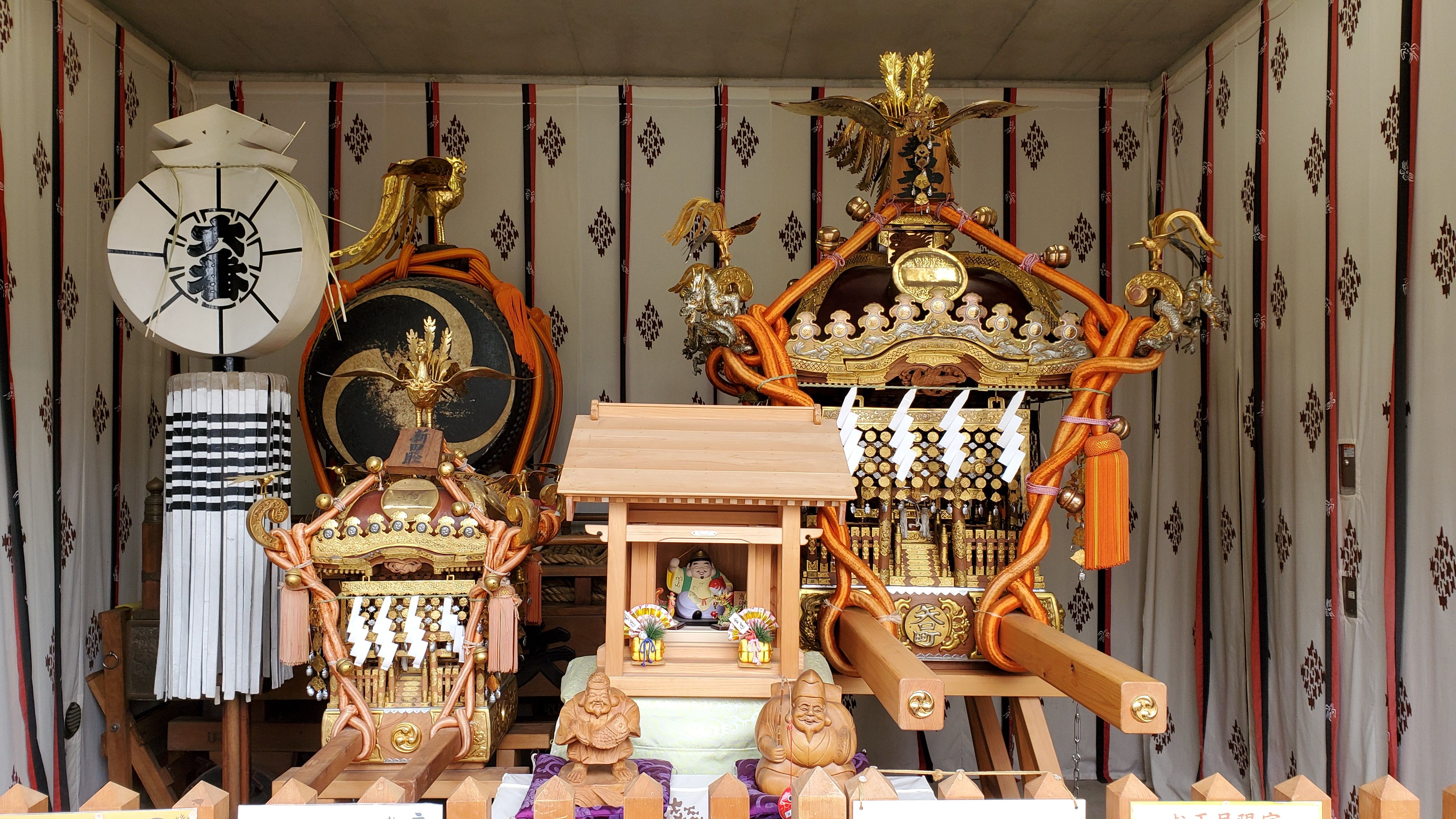 右は神輿庫……でも、納められている神輿と山車は、正確には氷川神社のものなんだって。元来この矢口地区の氏神様は氷川神社だそうですが、昭和20年4月の空襲でここ新田神社や氷川神社の社殿をはじめ、両社の神輿などもすべて焼失した。そこで、地元の総代・崇敬者・有志が集まって昭和33年に氷川神社の社殿や神輿・山車を新たに造ったのですが、その後氷川神社の神輿庫の老朽化が進んでしまう。平成20年、新田神社・鎮座650年を迎えるにあたり、新たな神輿庫をここに造り、氷川神社の神輿と山車を陳列することになったとのことです。