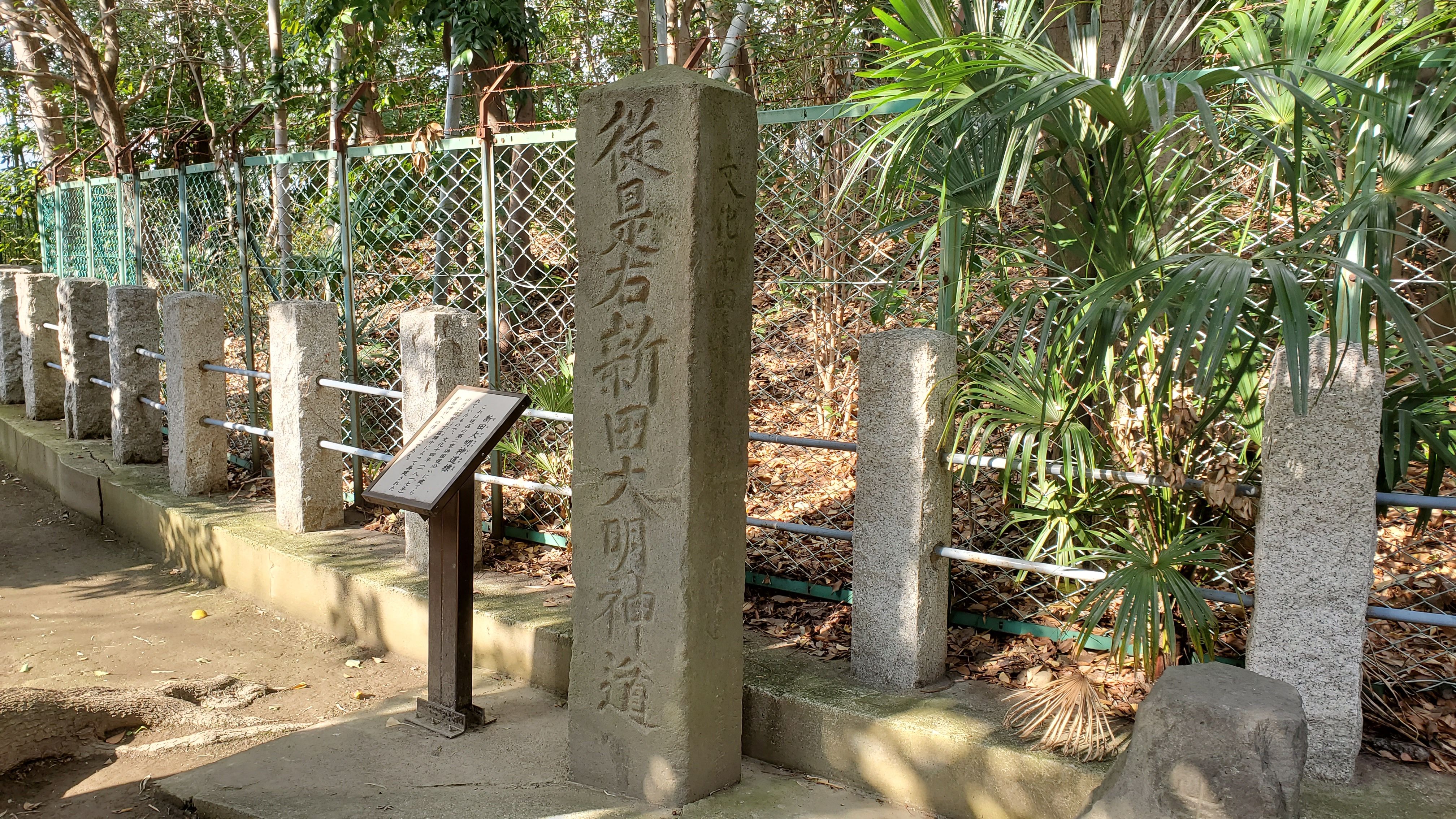 新田大明神道標……現在の第二京浜国道沿いに建てられていたもので、文化14年(1817年)4月に麻布日下窪講中によって再建されたと……新田神社が昔は 新田大明神と呼ばれていた証です。