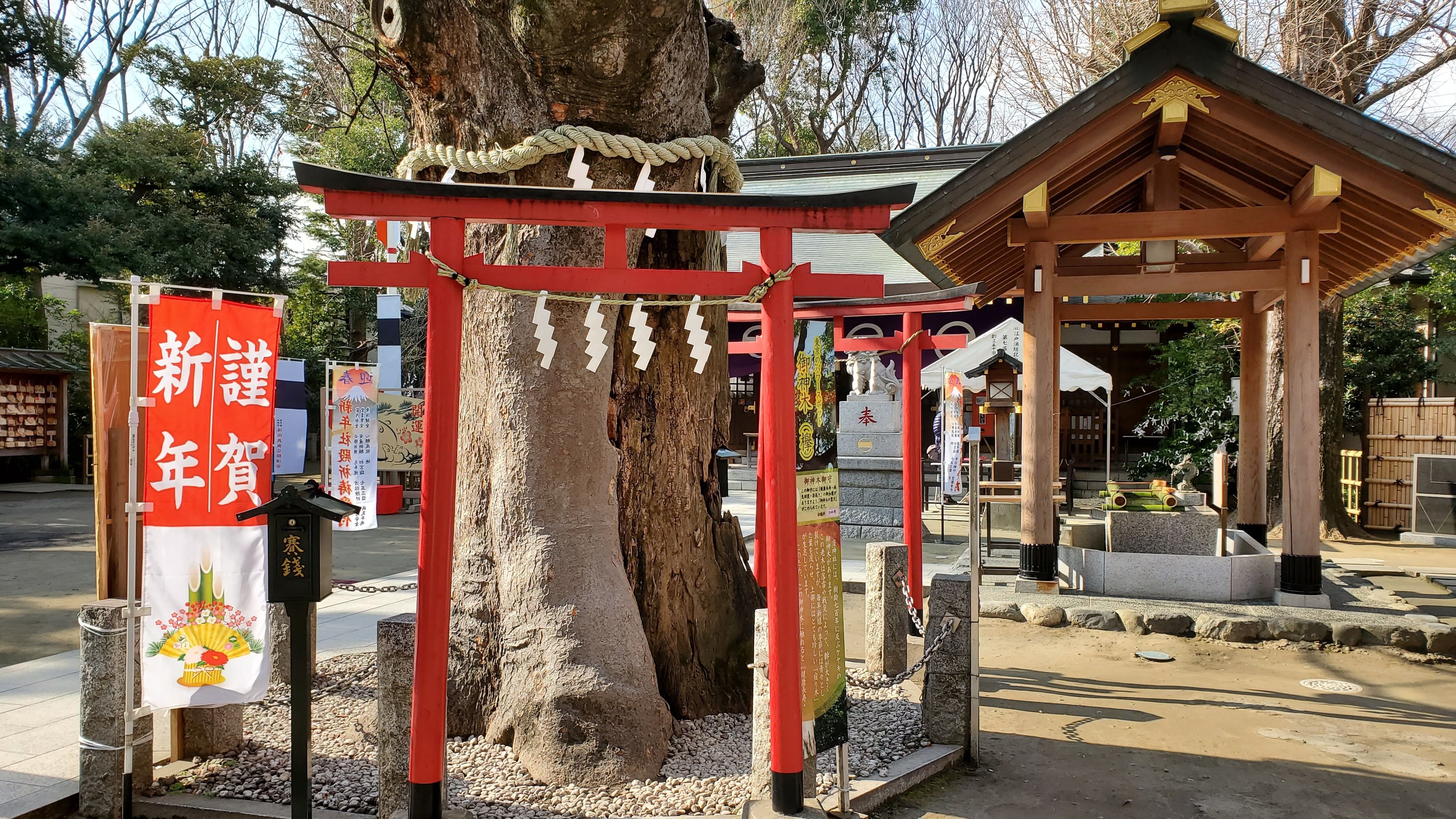 この御神木に触れると「健康長寿」「病気平癒(へいゆ)」「若返り」の霊験があると伝えられているそうです。御神木の御加護をいただくには、写真の反対側の鳥居から中に入り、できるだけ長く御神木に触れて霊気を感じることだそうです。鳥居への出入りでは一礼を忘れずに……