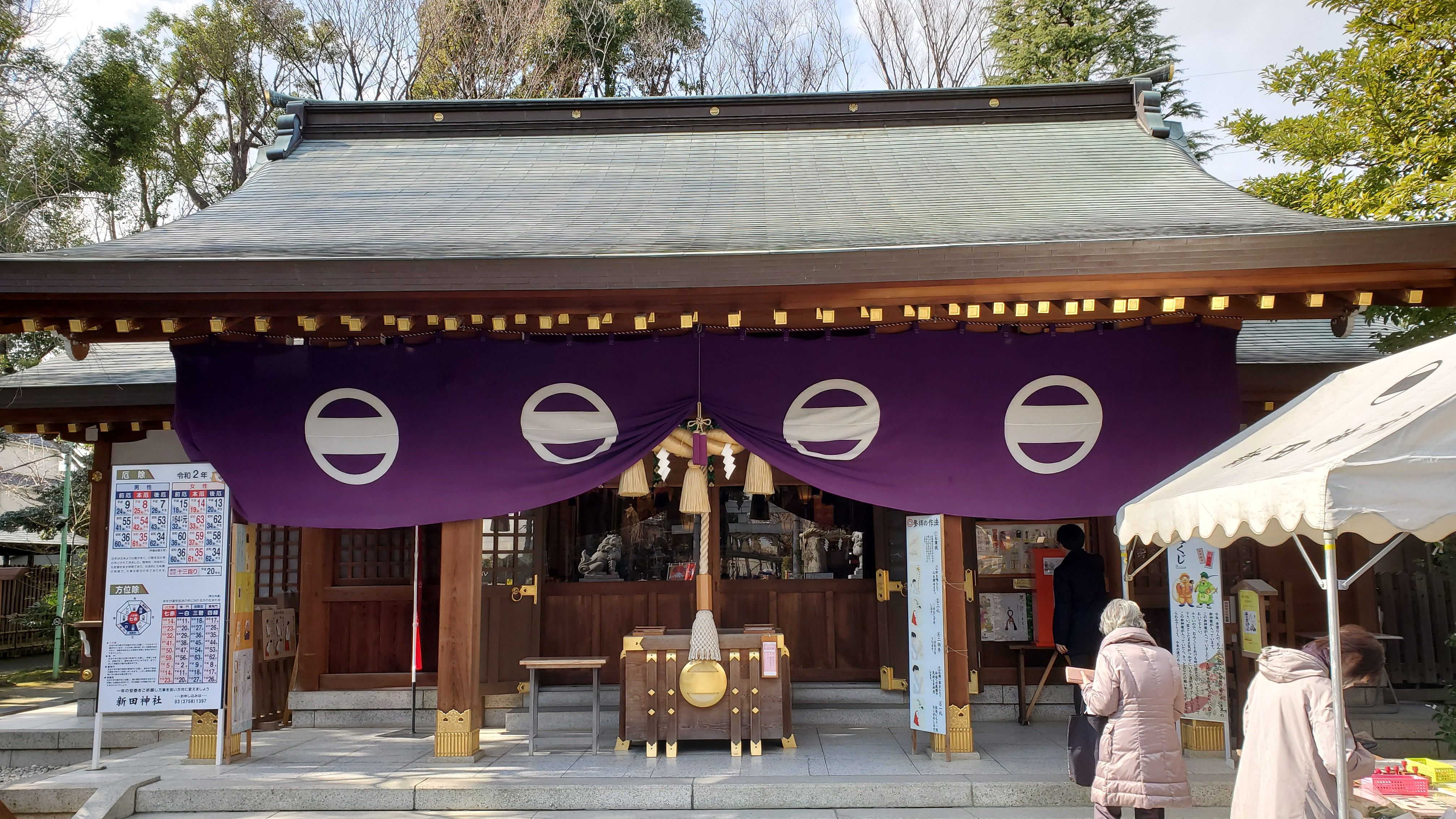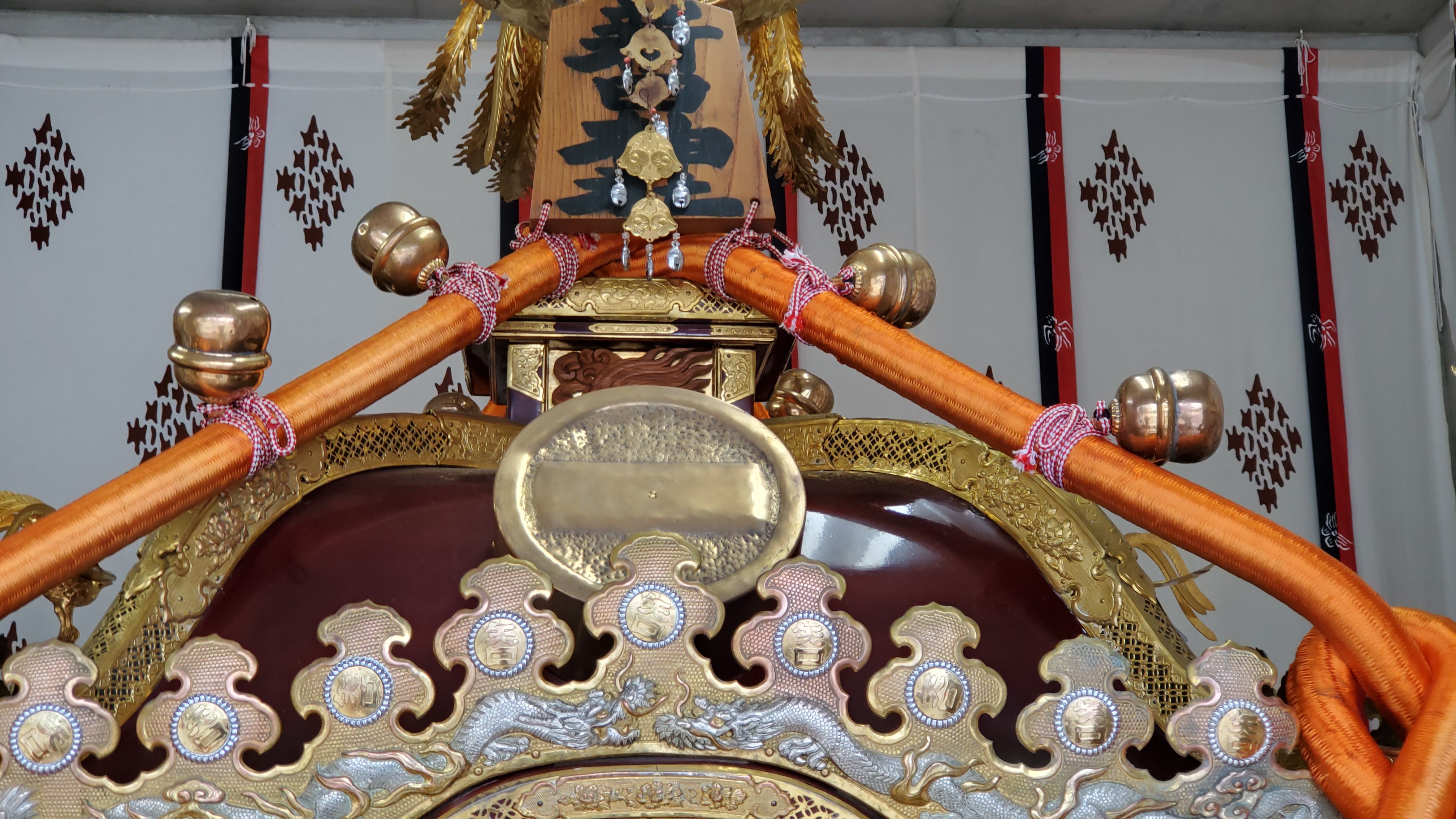 戦災後、新田神社では独自で神輿を作ることはしなかったそうで、両社の祭礼でこの神輿が渡御(とぎょ=お出まし)できるよう、正面と後部には氷川神社の社紋『左三つ巴』、そして左右の側面に新田神社の社紋『一つ引き両』がつけられているとのこと。