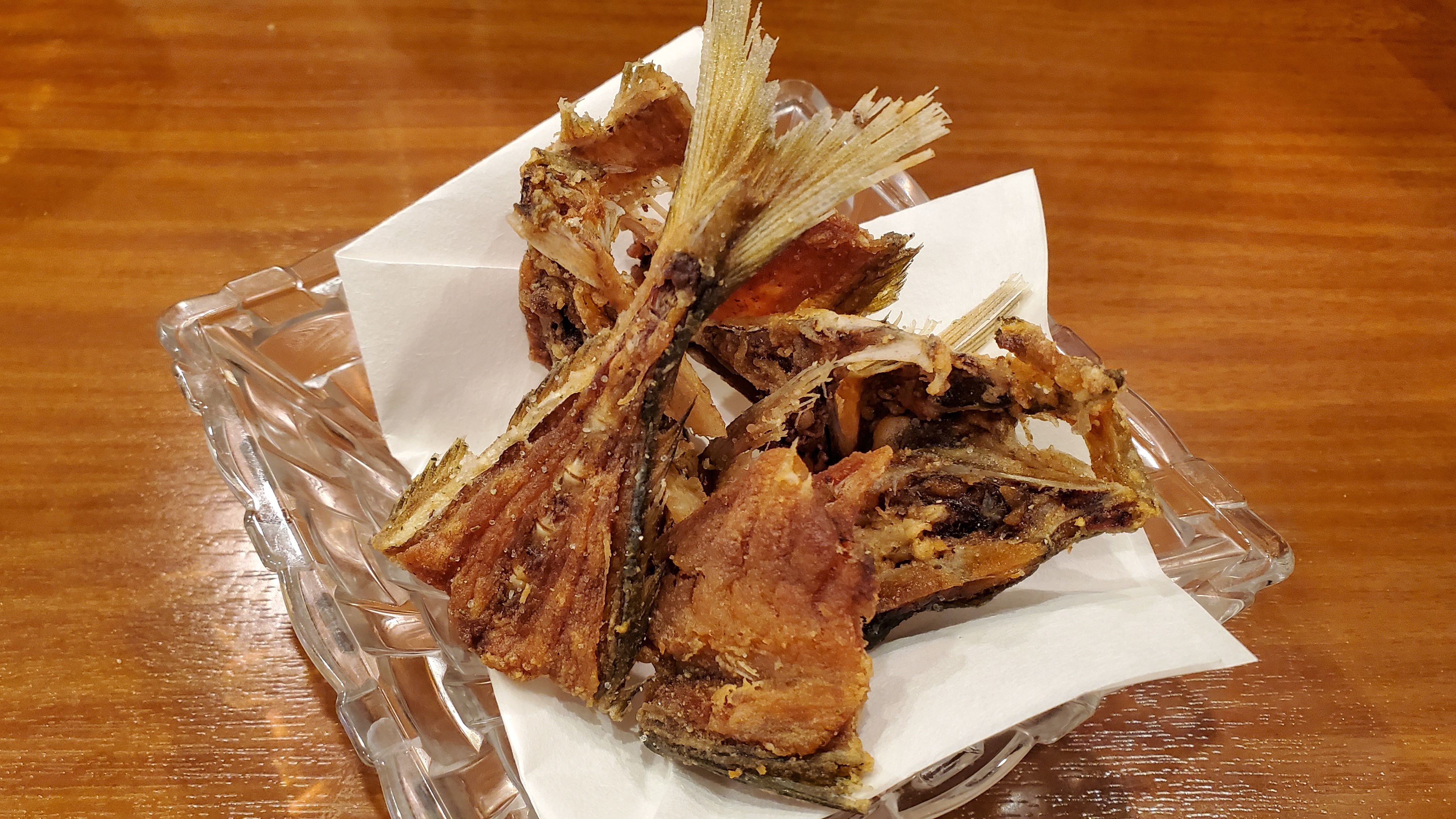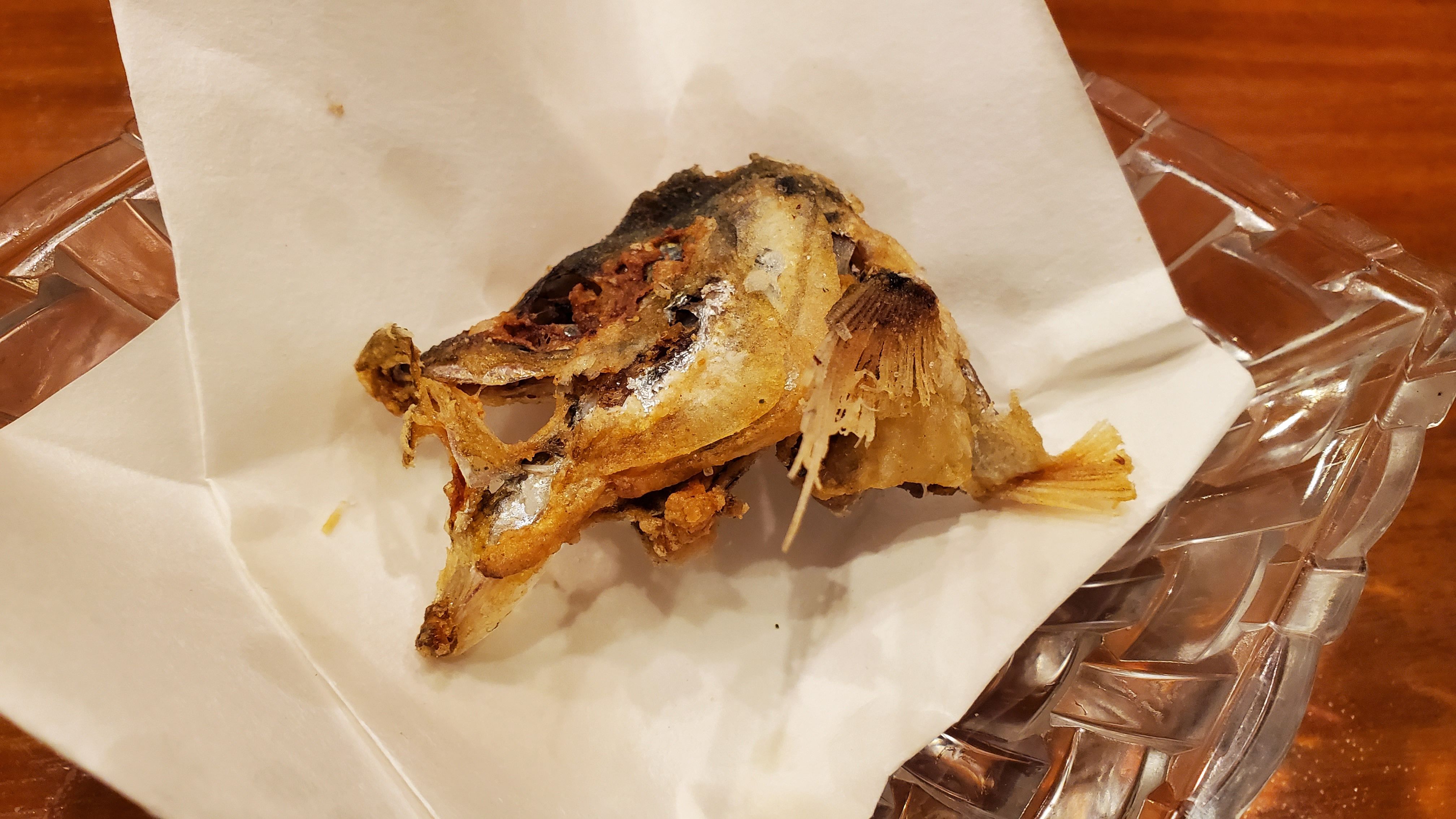 頭は縦割りにして揚げてありました。だからサクサク食べやすいんだわね~ さすがプロの技であります。そうそう、エラの部分も外すそうです。