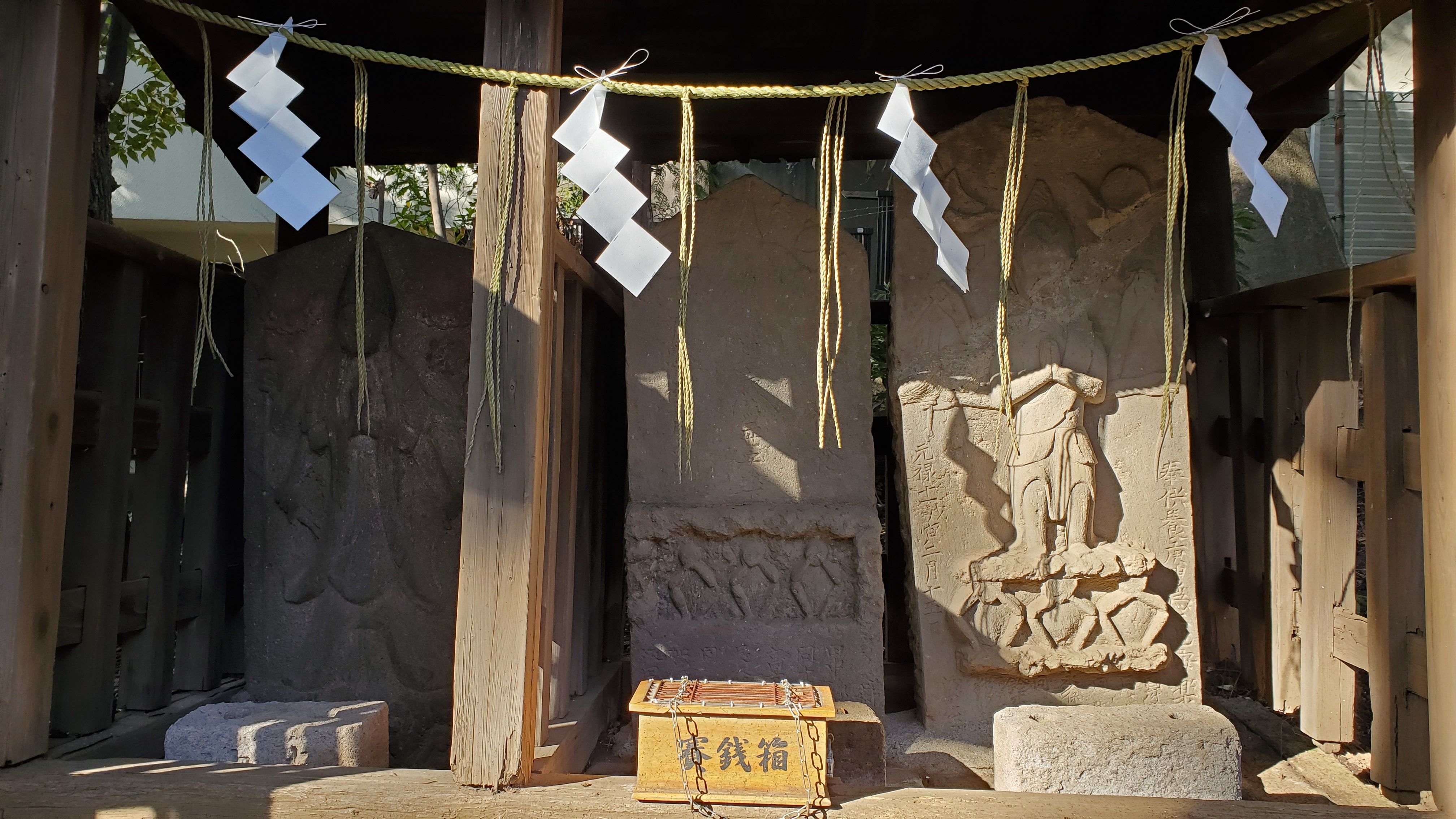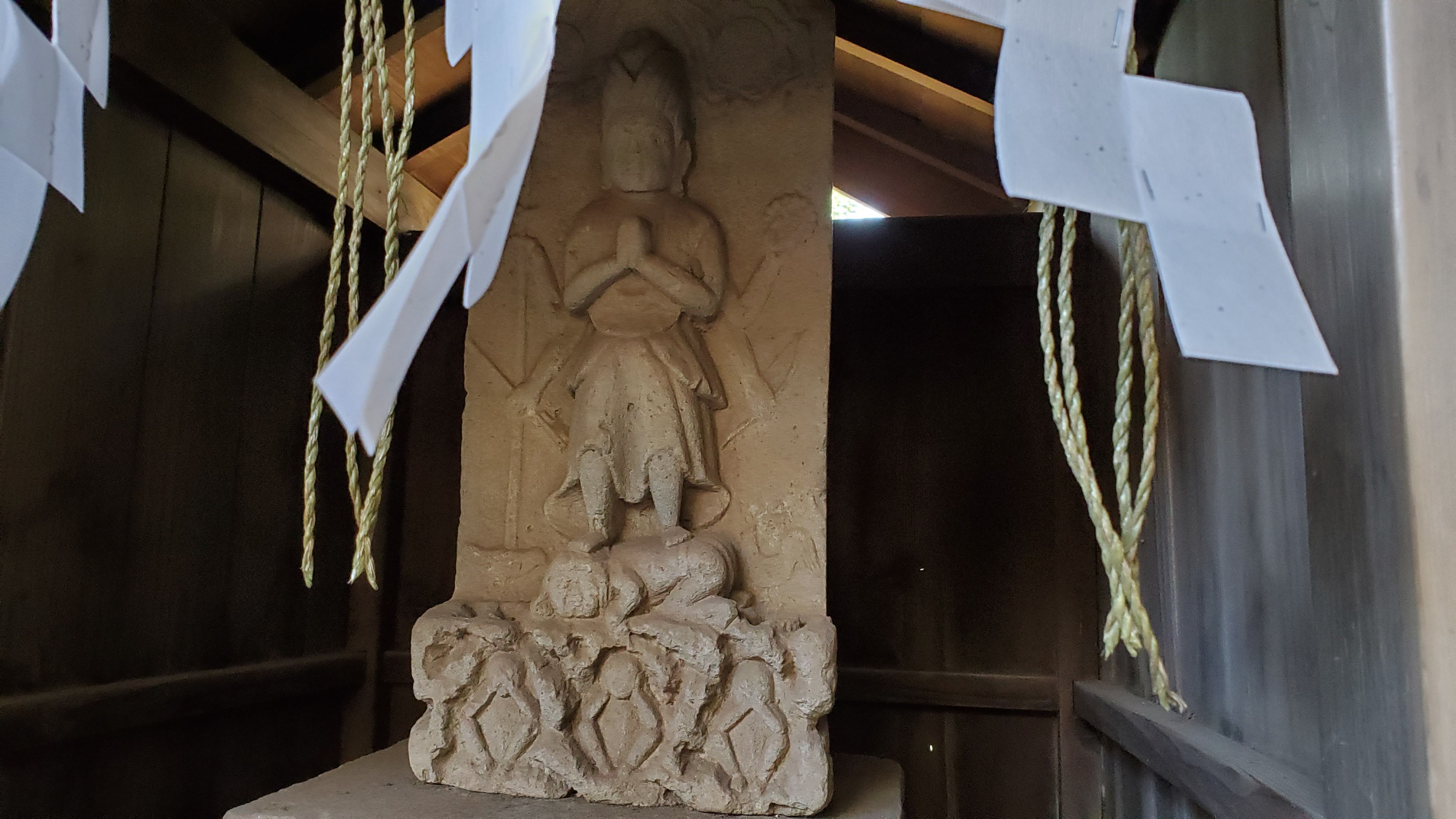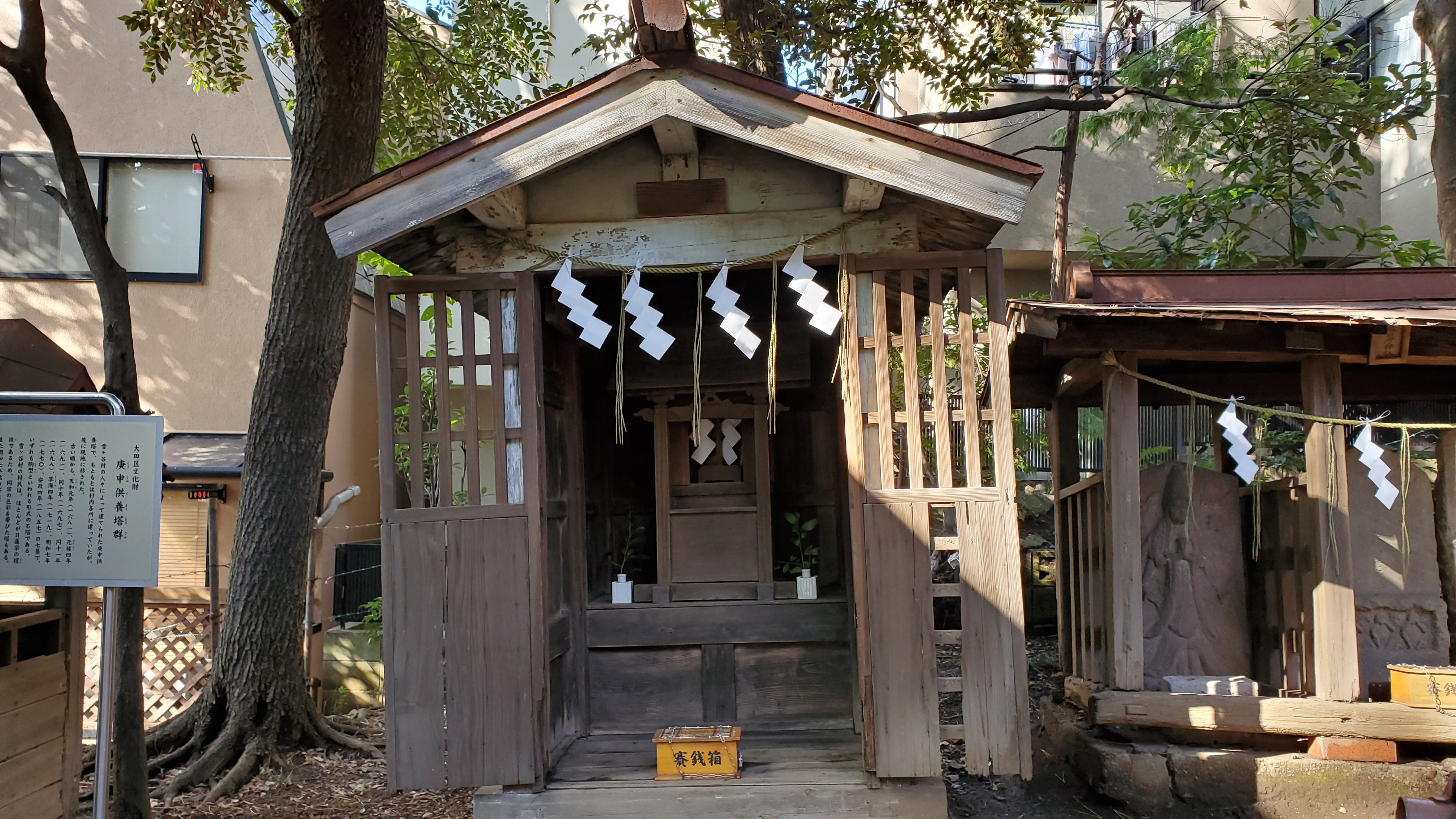 こちらは屋根が崩れかけています……庚申塔はしっかりしているのに……