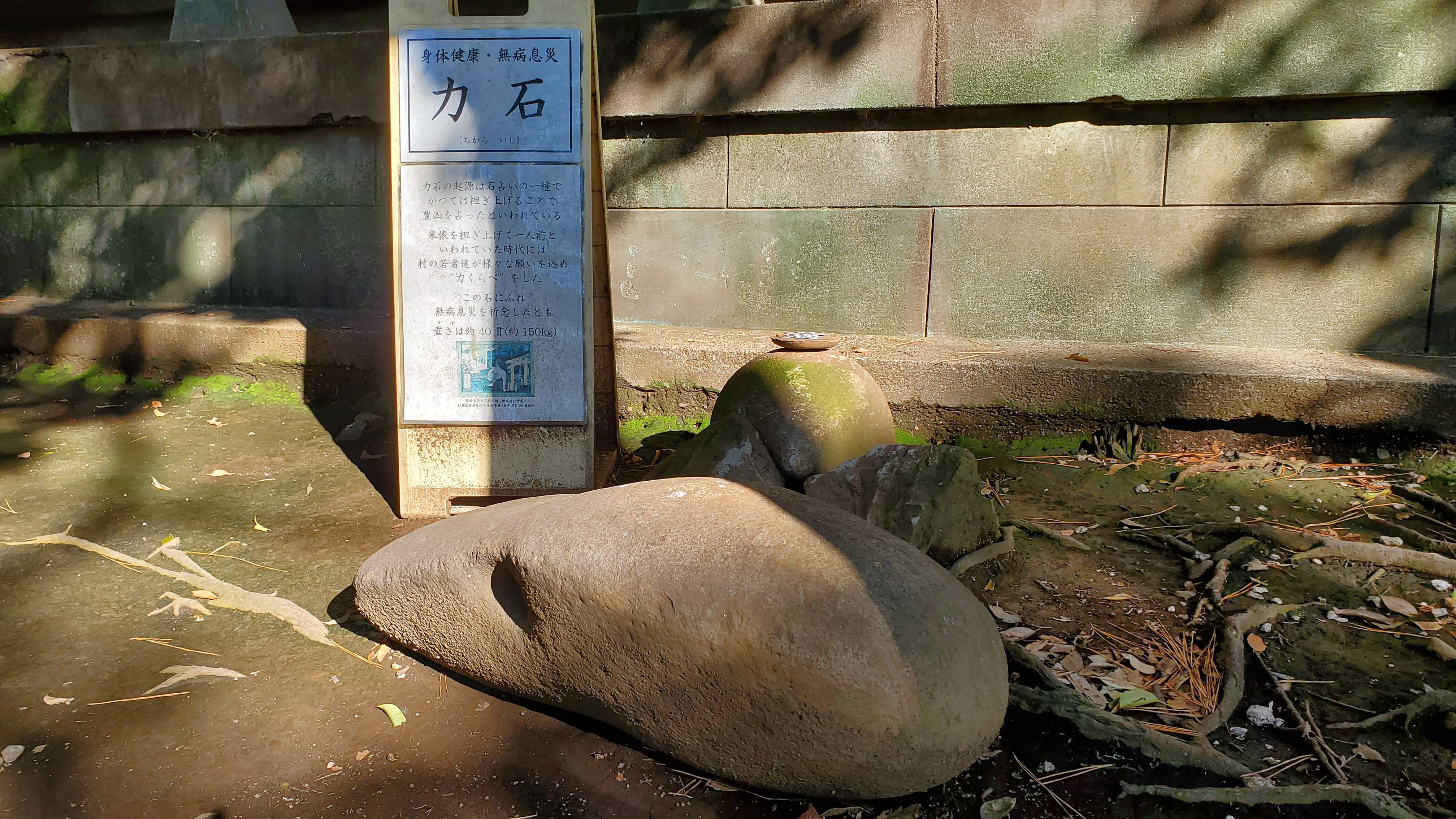 米俵を担ぎ上げて一人前といわれていた時代、村の若者たちの力くらべに使われた石。重さ約40貫(約150kg)……私には無理……若者でなくてよかった~