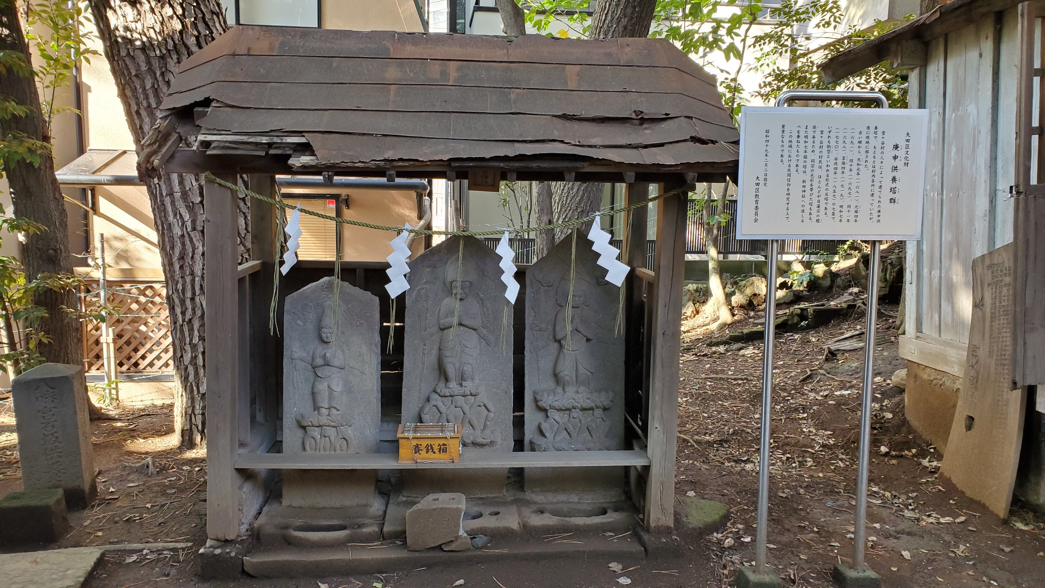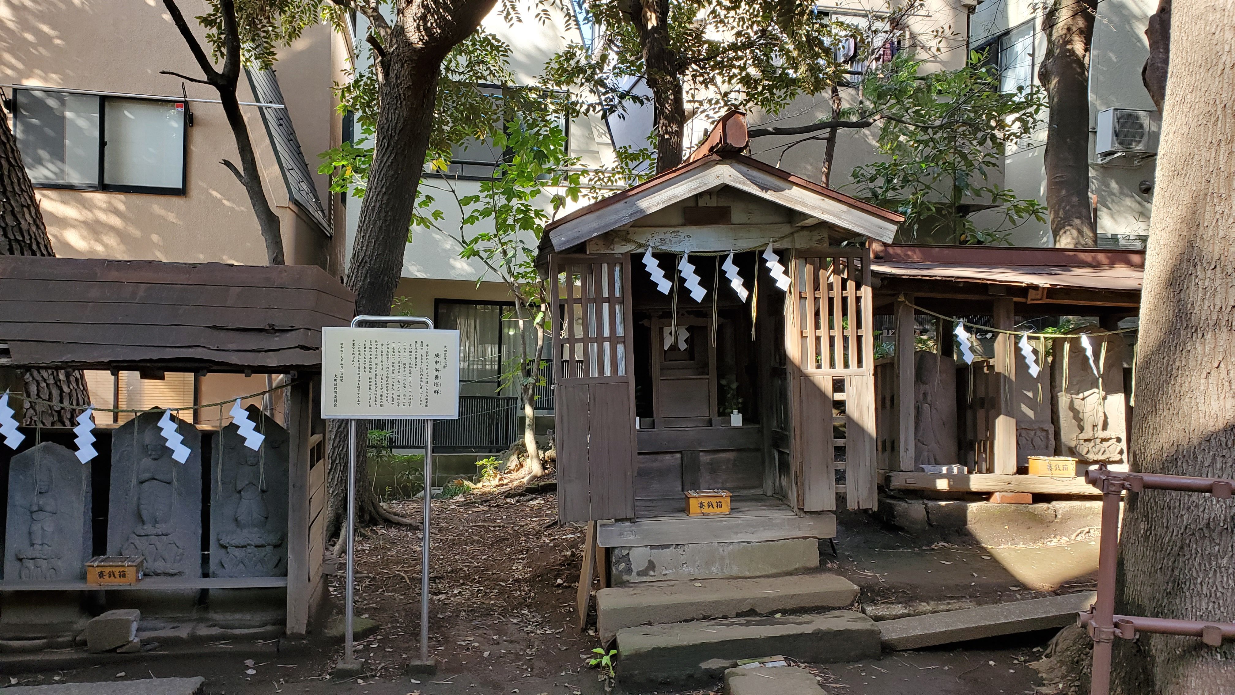 奥には右から左へと庚申供養塔群…… 天和元年(1681年)から安政4年(1857年)まで大田区文化財 の7基……