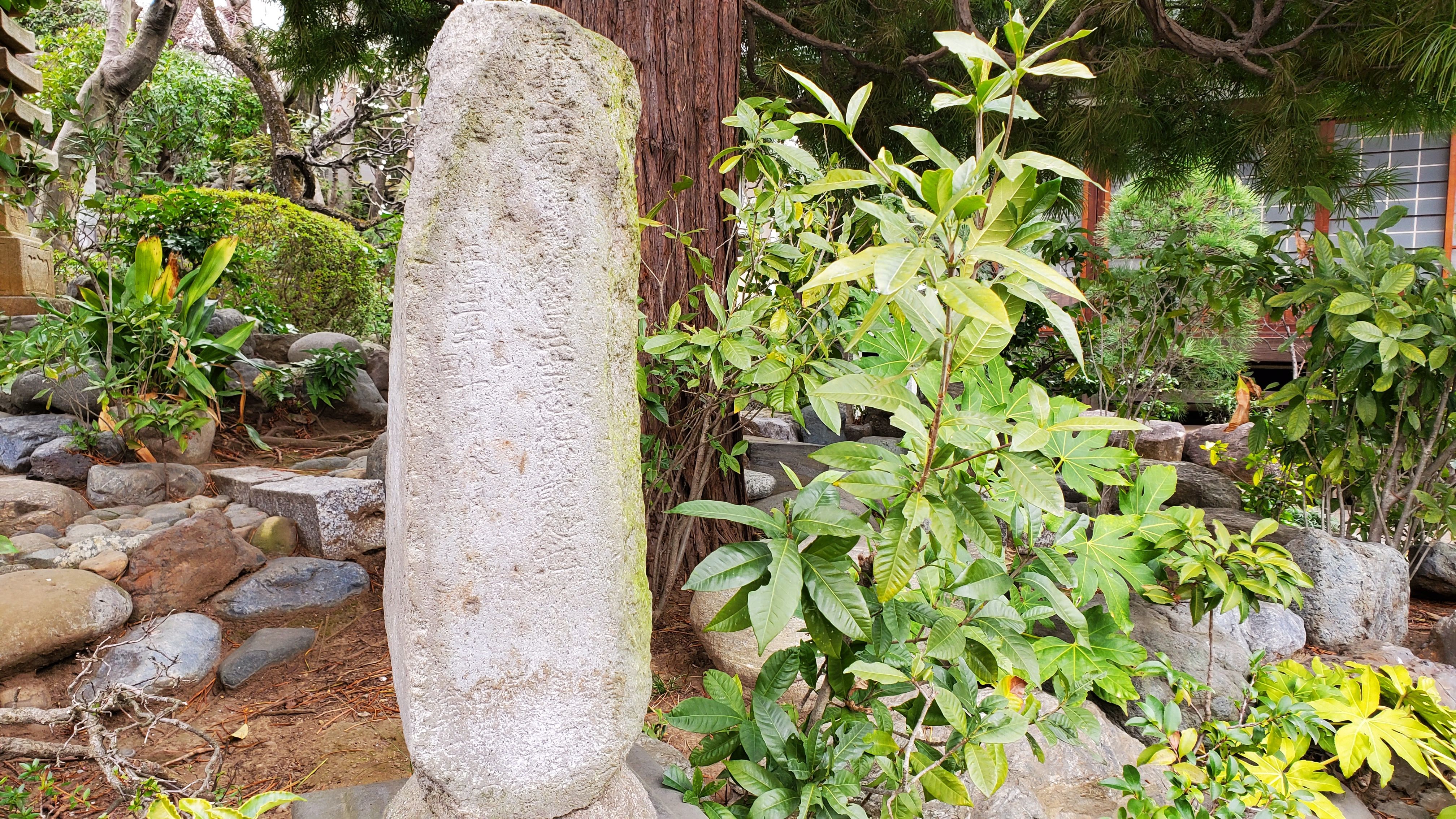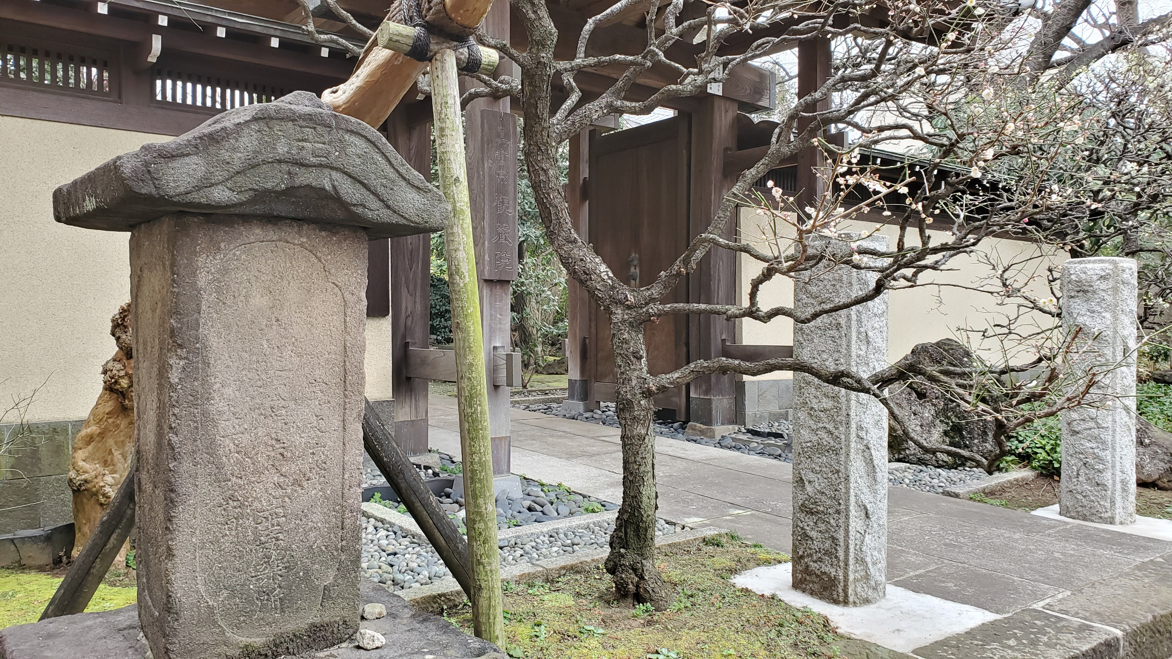 この碑はまったく読めません。門前の白梅がチラホラ……