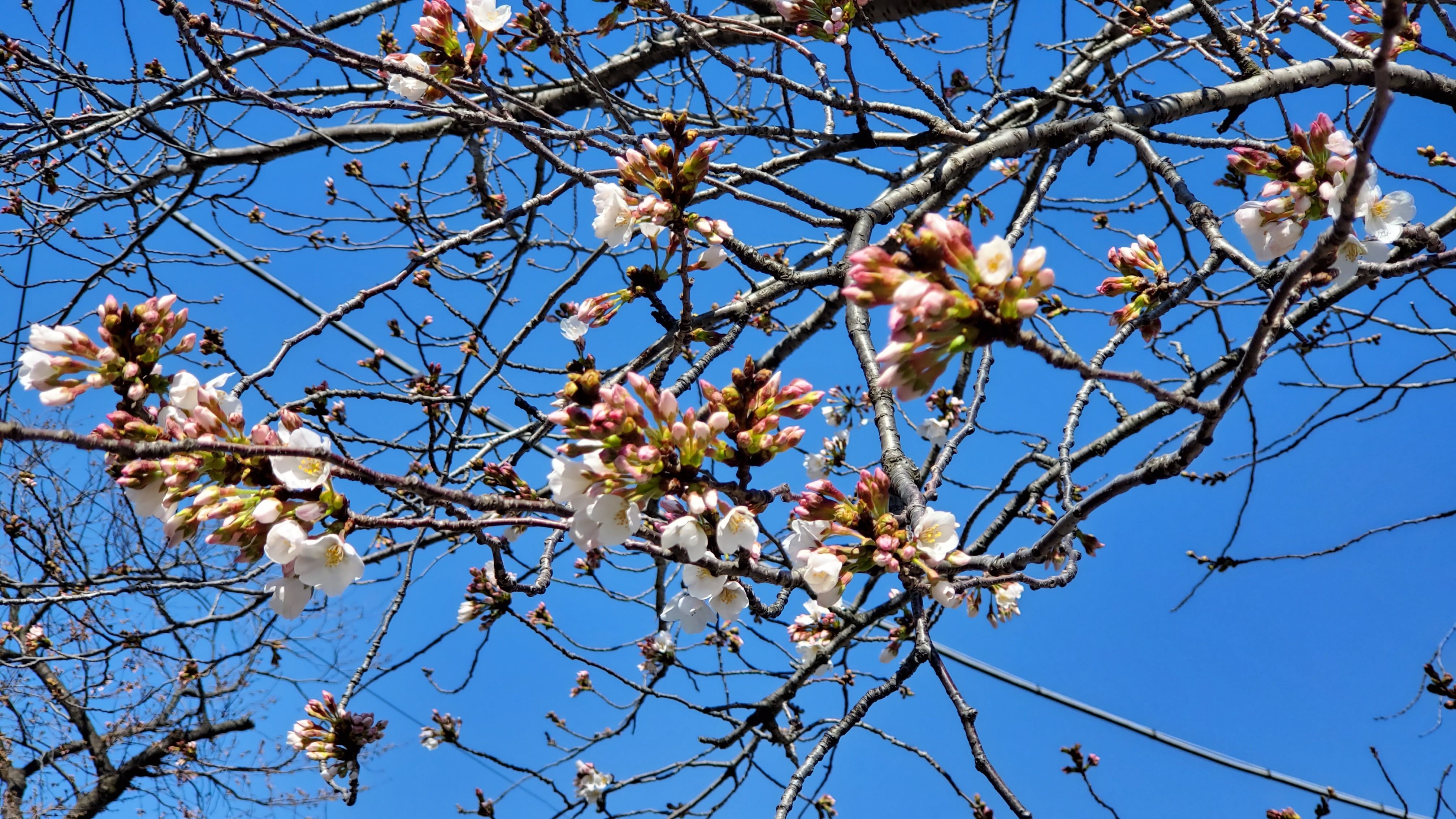 今日の立会川緑道・9時7分……日に日に白い花びらが目立っていきます。日曜日にはどこまで咲くことか?