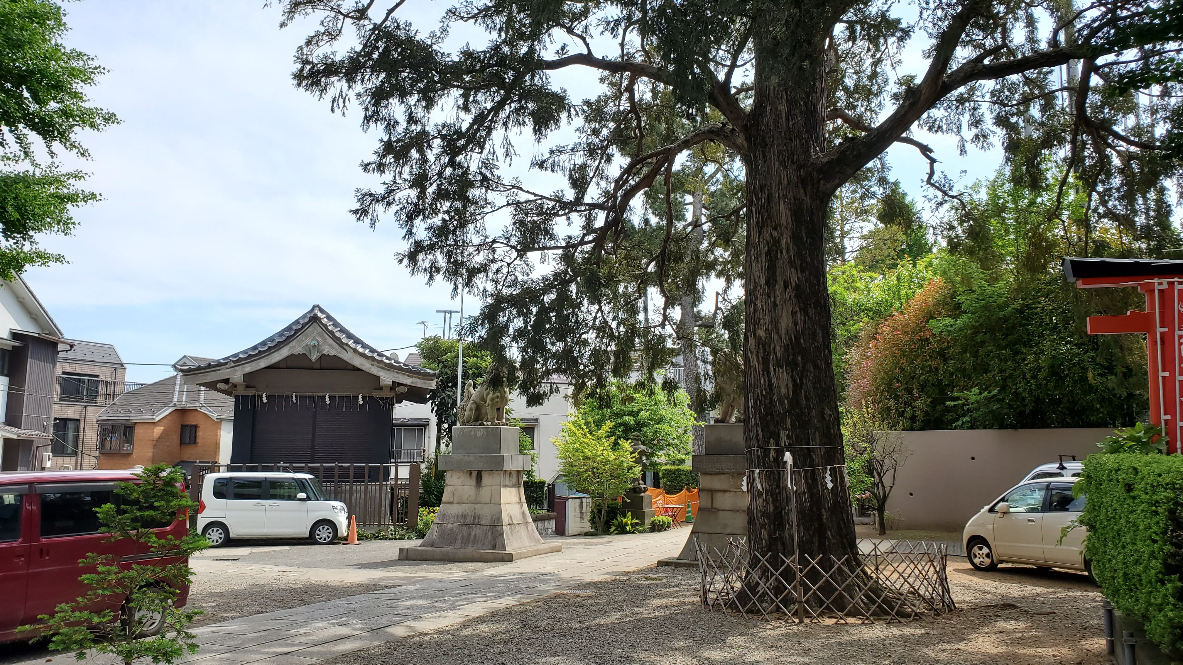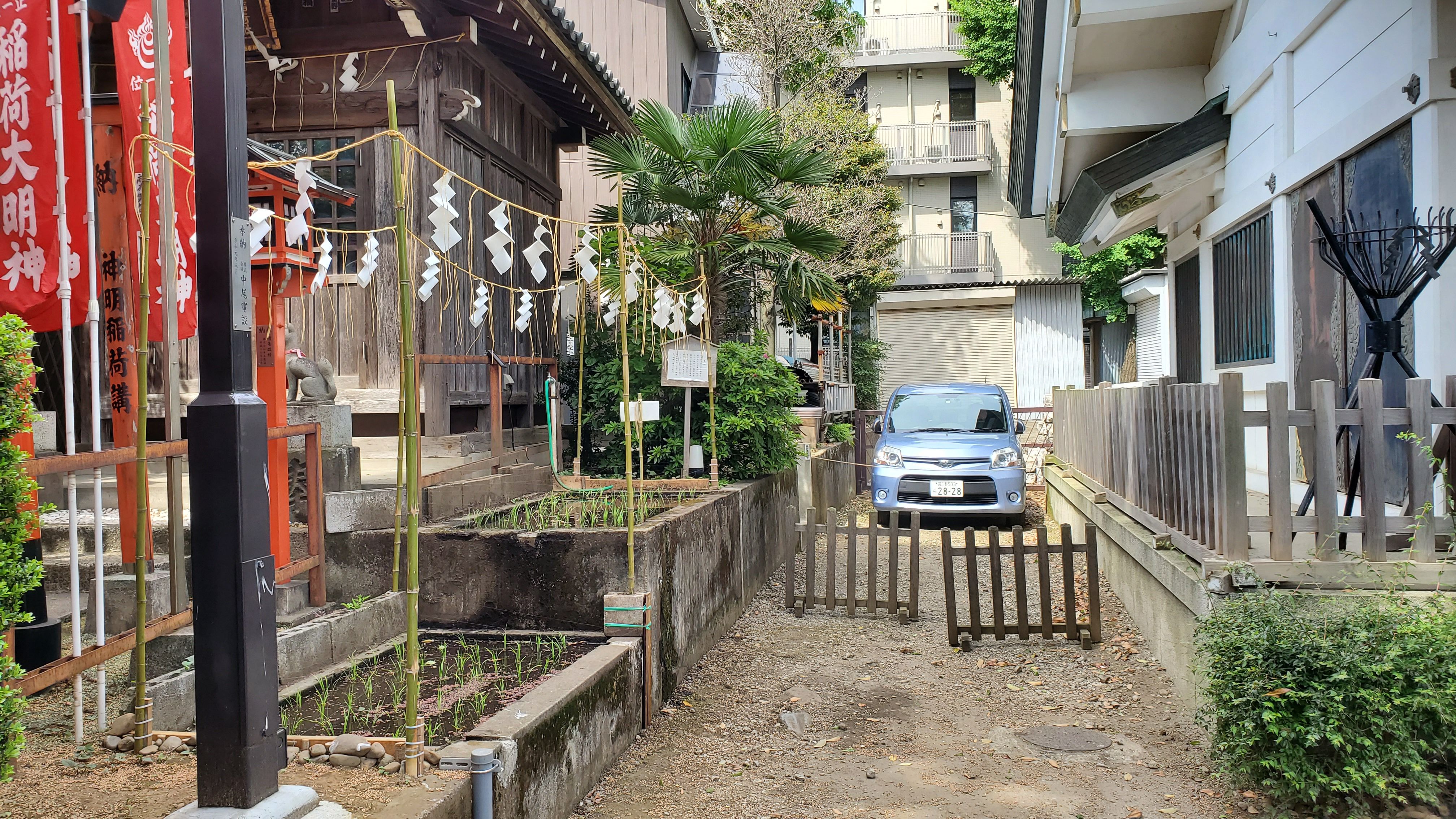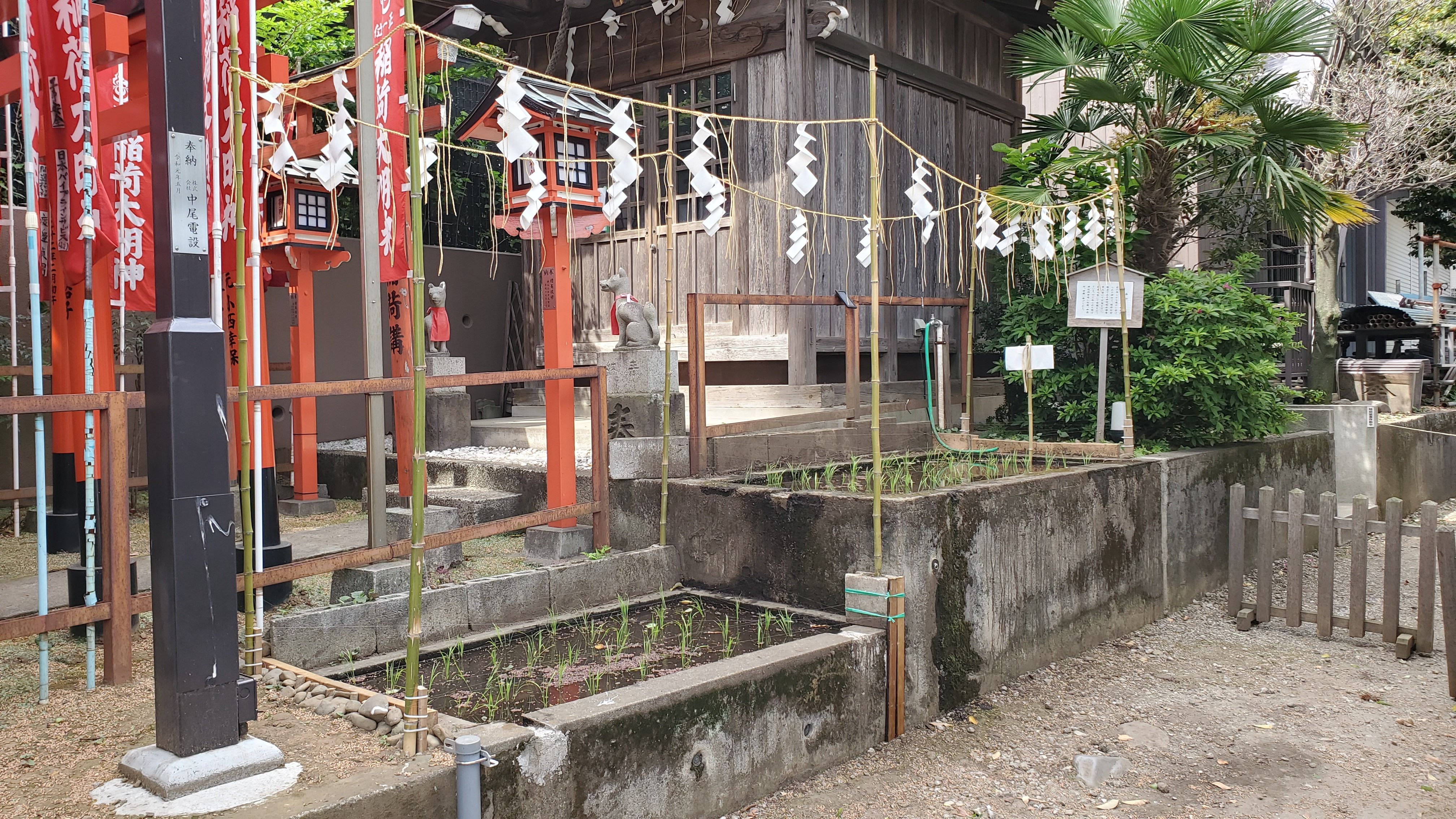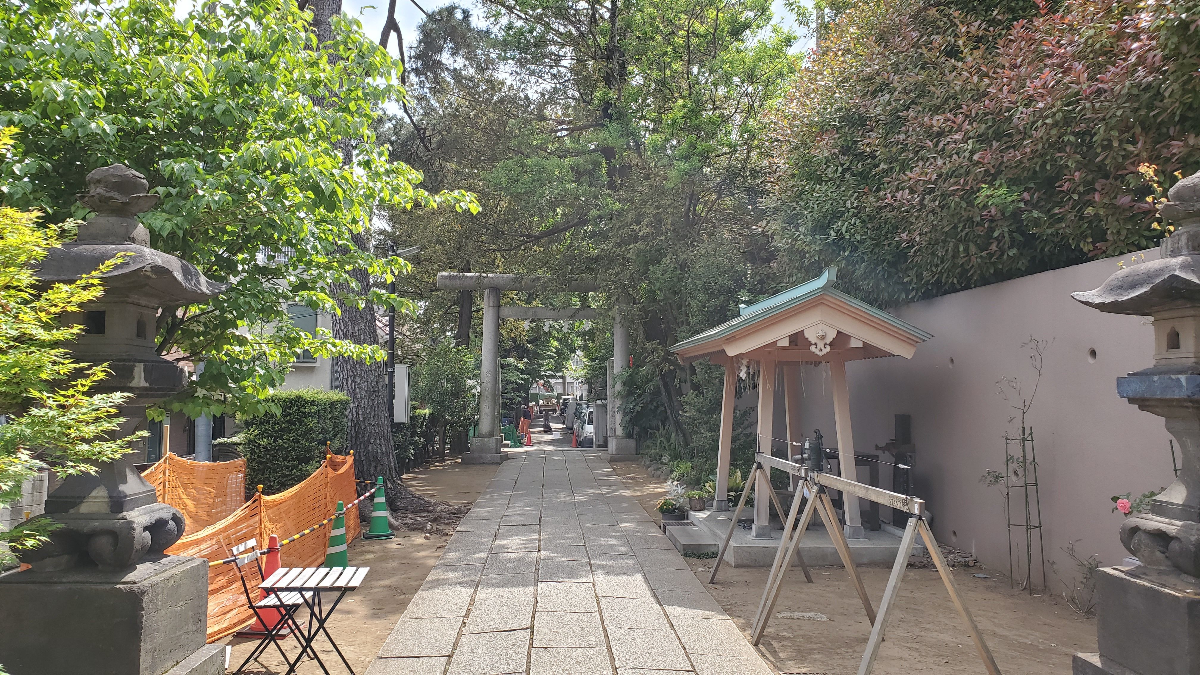 小市郎稲荷から見た境内……参道が工事中の為にこちらに置いているのでしょう。