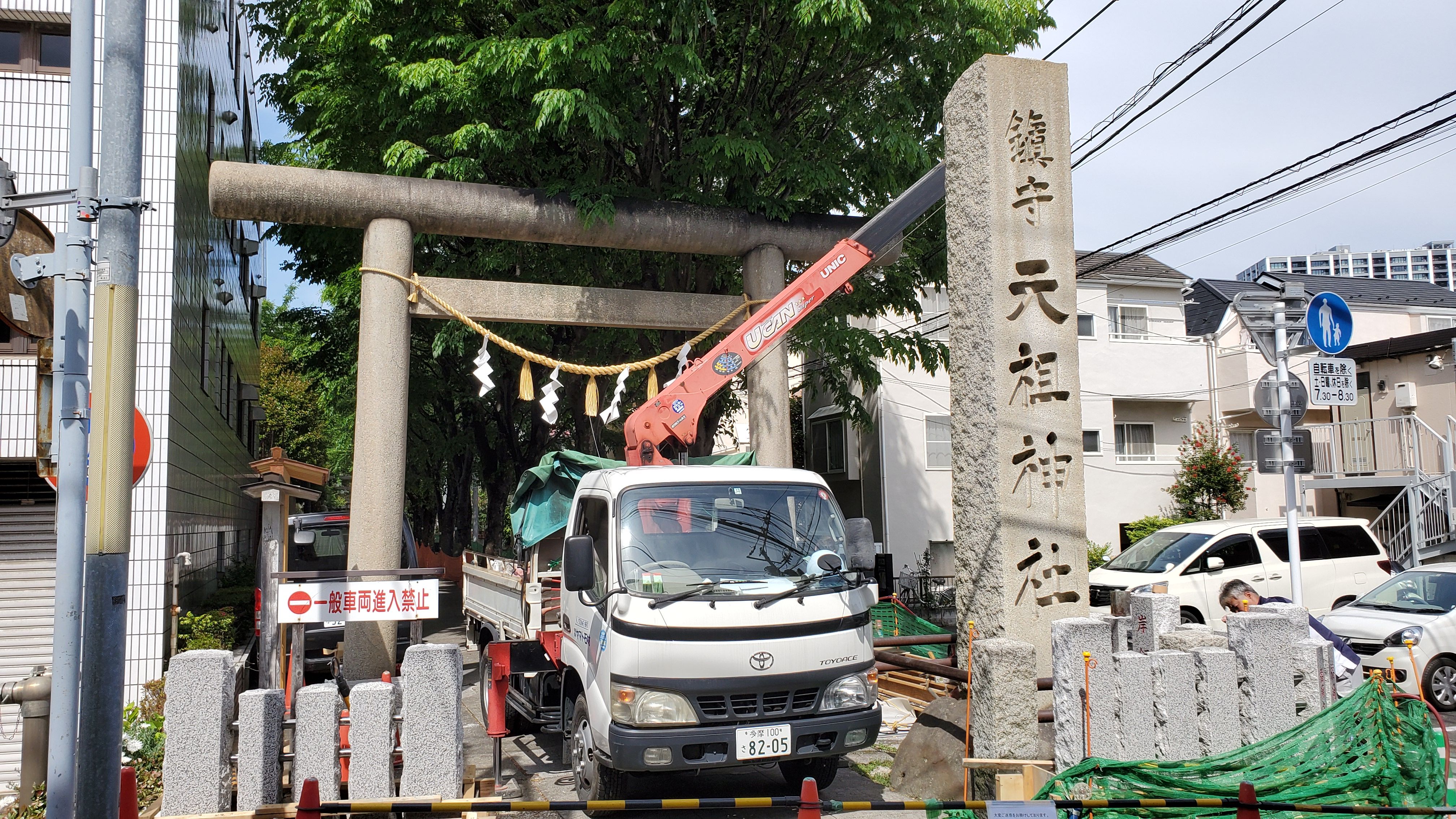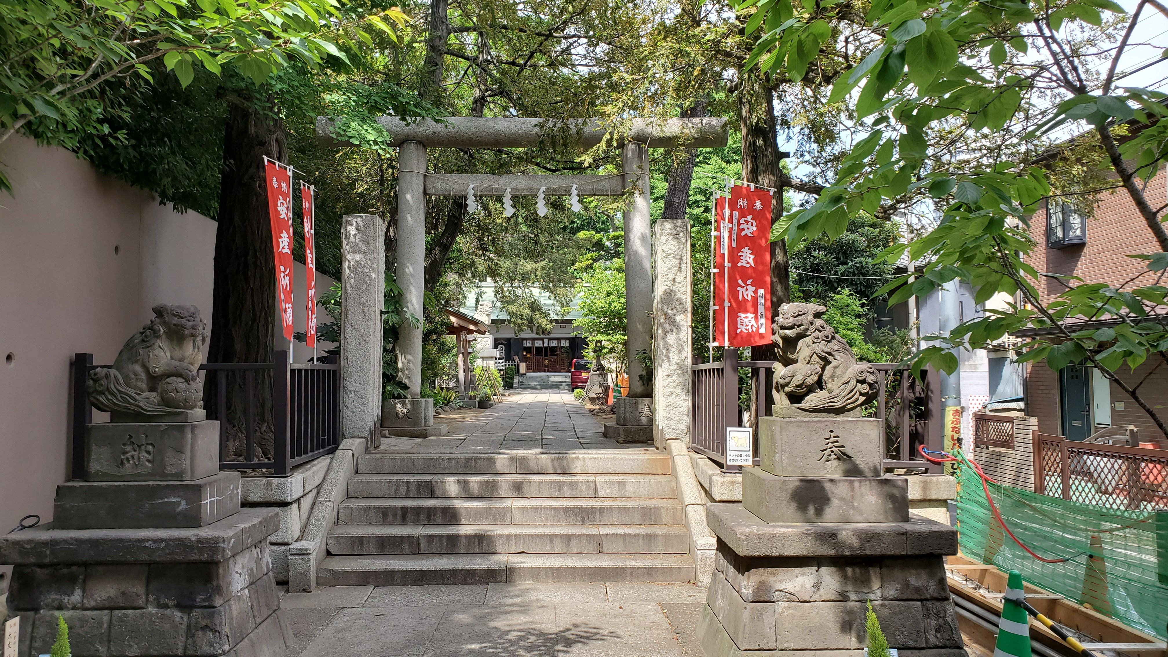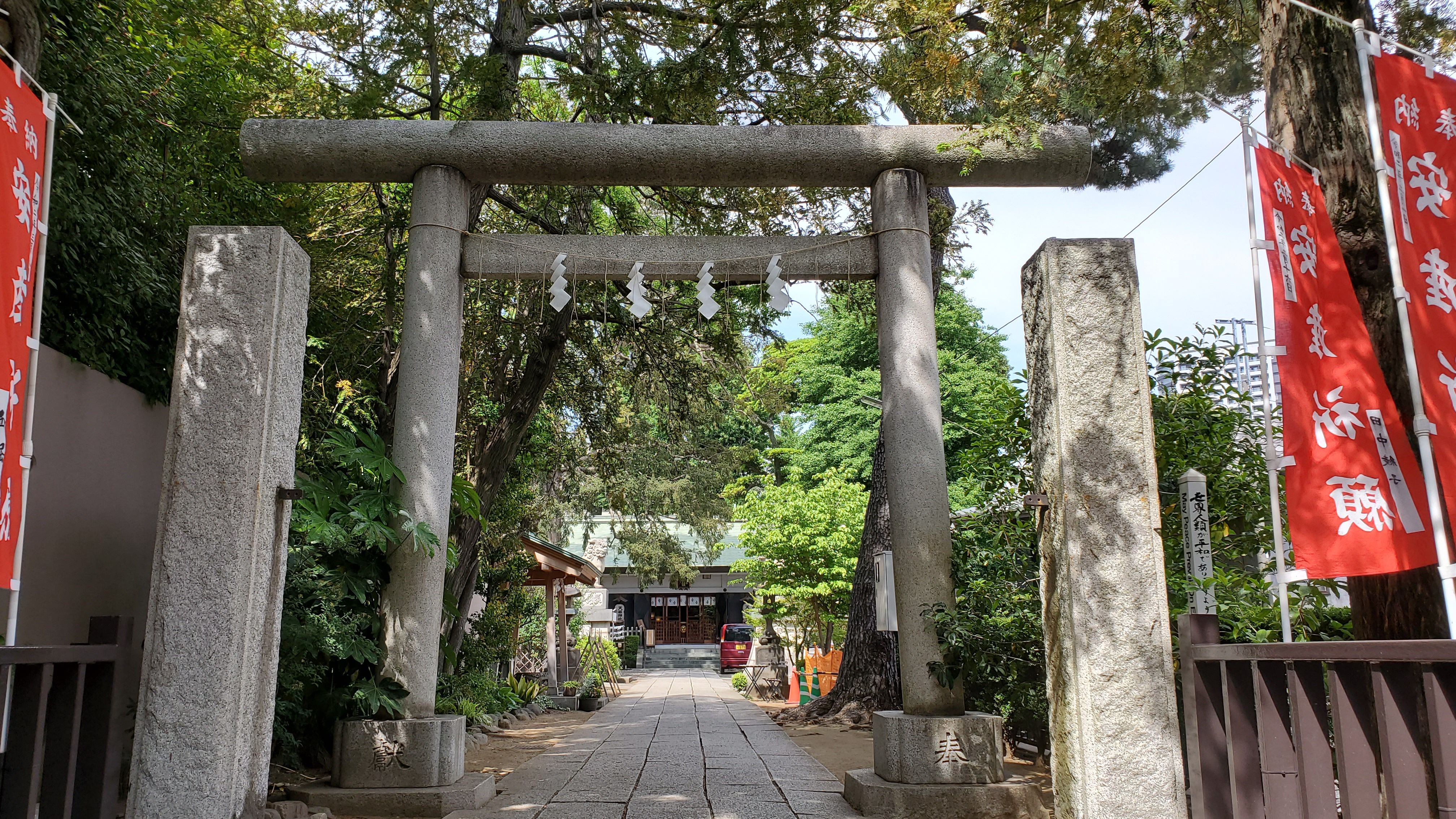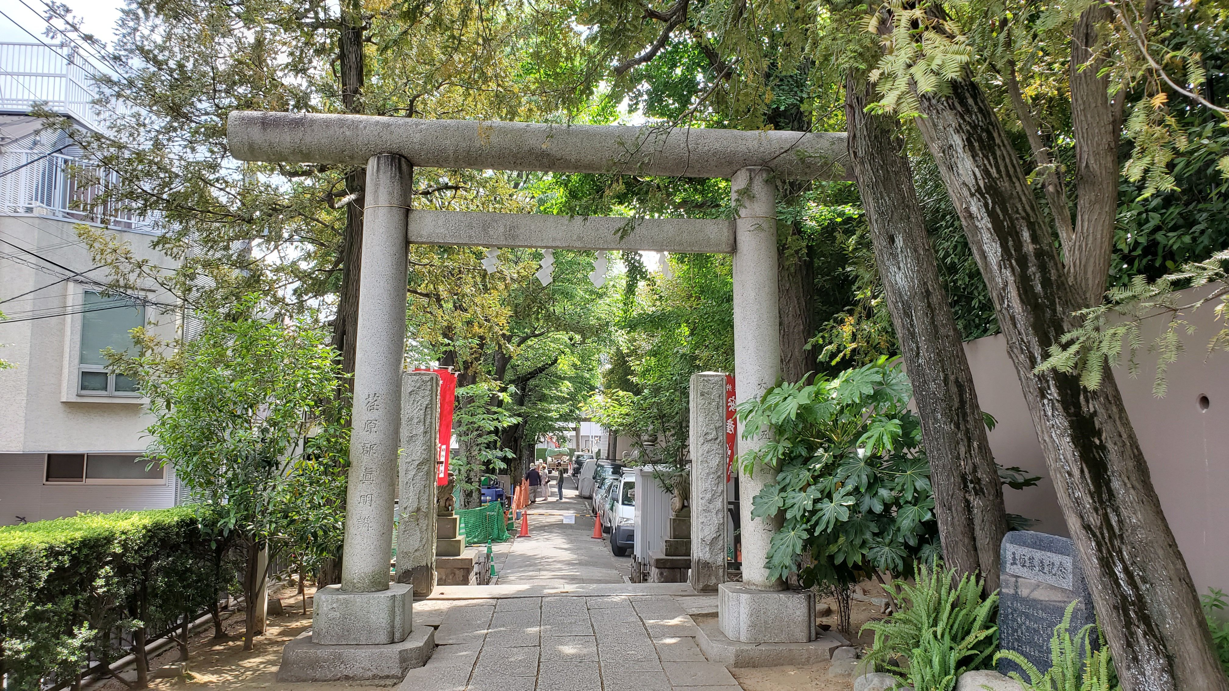 小市郎稲荷から見た境内……参道が工事中の為にこちらに置いているのでしょう。