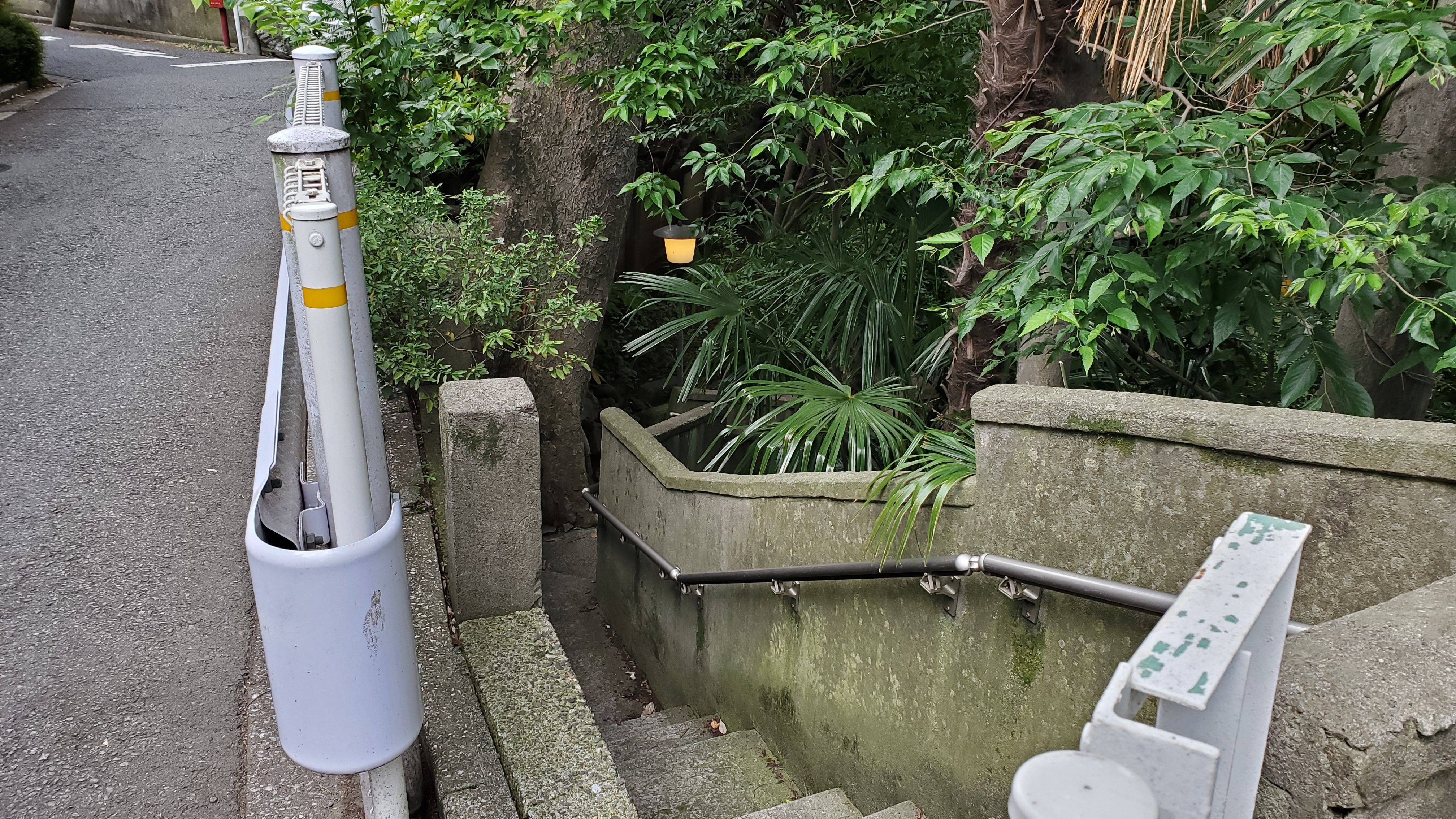下りきるとこんな感じで左は殺風景……正面にしっかりした鳥居があるから、また裏口入社した私。