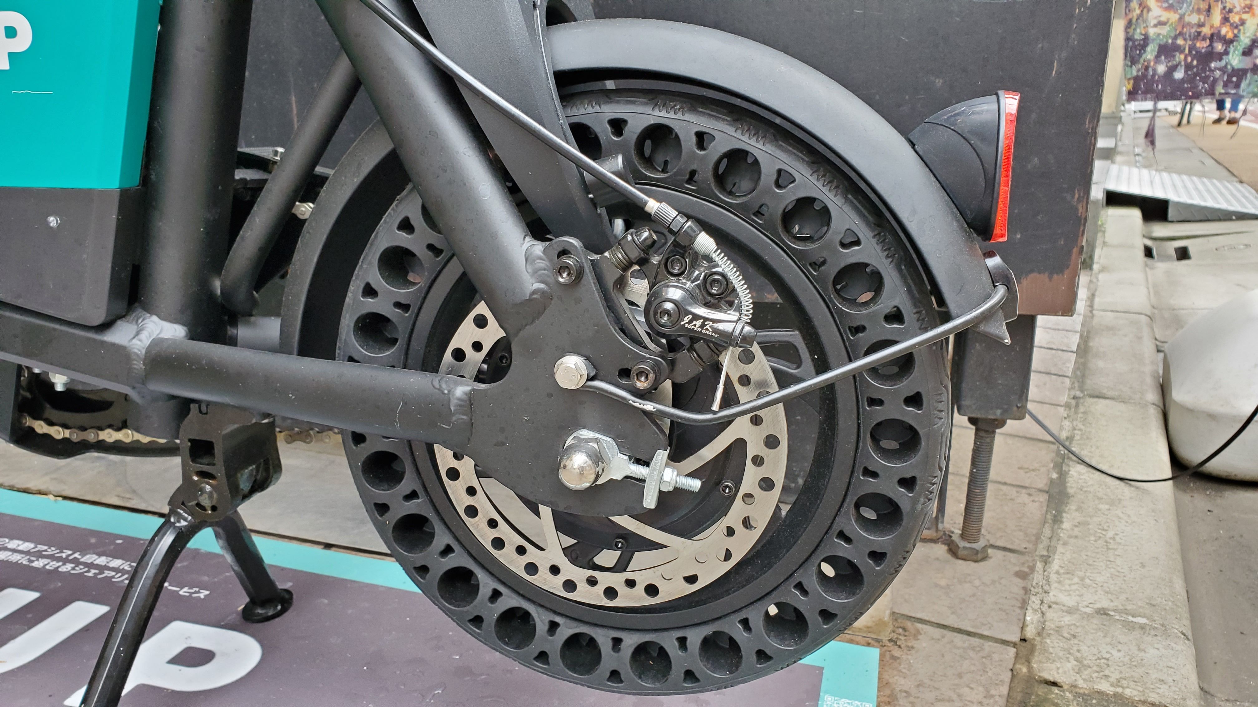 ブレーキはディスクなんだ~ おっと、このタイヤはチューブレス? パンクしないみたい。良く考えてます。