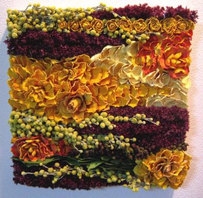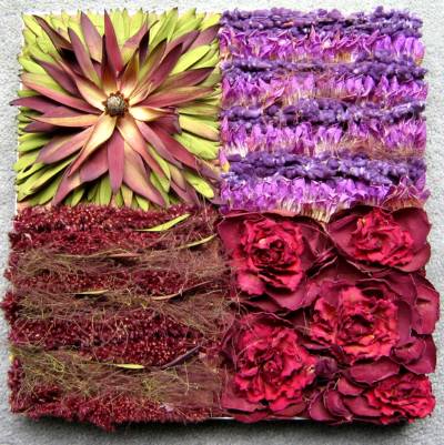 暑くもなく寒くもなく、そして雨も降らずに心地よい日でした。昨日茅ヶ崎に行ったら帰りは深夜になってしまったので、かなりの寝不足・・・それでも少し早めに家を出て、バイトの前に銀座ミキモトと教文館に寄り、「藤城清治作品展」を観ました。小さい時に見た影絵の天気予報はすごく恐くて、1人で見るのがイヤだったんですけど。今では涙が出そうになるくらい感動しました。猫好きの私としては、頻繁に猫が出てくるのも嬉しい限り。少し前にリトグラフを手に入れましたが、オリジナルの影絵を見てしまうともう全然ダメですね・・・影絵と版画じゃ違って当然ですけど(苦笑)9月のドライフラワーです。 今月のテーマは「紫」私は普段あんまり紫を好んで使ったりしないので、特に難しい色の1つでした。苦肉の策で4分割にしてみたけれど。全然ダメね。今日は素敵な影絵を沢山観たので少しでも私の脳が感化されてる事を祈るしかないって感じ(苦笑)そうそう、もう1ついい加減に仕上げてしまったものがあります。ハワイアンキルトがようやく仕上がりました。画像ではわかりづらいけど、90cm角くらいの大きさのタペストリー?で、かなり縫い目がテキトーです。キルトは性格上合ってないと思うので、もう作ることはないでしょう(苦笑)