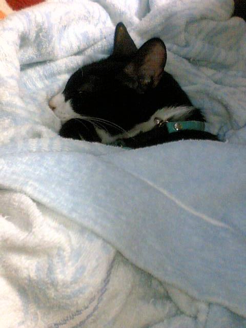 昨シーズンは一度も風邪引かなかったのに今年はもうすでに2回引いてしまいました。喉の痛みから始まり、クシャミ・ハナミズ・そして最後には咳が止まらず・・・もう冬なんだなぁ~2ちゃんのニュー速を見ていたら「猫ちぐら」話題が載っていました。ずーっと買いたい買いたいと思いつつ、でもきっとすぐボロボロにされちゃうだろうと決断できずに何年も経ってたりして。その猫ちぐらの販売サイトで気になる文章が。「猫の本能上、狭い場所や温かい場所が好きですので喜んで入ります。しかし、人間のベットの中に一緒に入って寝るような猫はその本能を失っている場合が多いので、遊びで入っても寝るときにはご主人の布団の中に入る場合が多いようです。箱や籠をすみかにしている猫にとっては最高の贈り物です。」う~ん。。。うちの猫は私がベッドに行くと呼んでなくてもあとからベッドに入り込んできます。小さな身体のくせにベッドの大半を占領して私は時々ベッドから落ちそうなくらい隅っこに追いやられてしまうのです。上の文章からするとうちの猫は入らない可能性大です(苦笑)しかも本能を失ってるとは猫失格じゃないの。 朝目を覚ました時にこの横顔があるとほんと癒される~。冬はベッドを出たり入ったりでうるさくて寝不足気味だけどこの顔を間近に見たいからやっぱりちぐらは注文しないでおこう。
