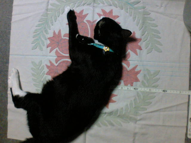 夏風邪を引いてからちょうど1週間経ちました。なんとか抜けたって感じです。先週の金曜日にはいい調子になってきたので友人と恵比寿に飲みに行ったんですが、帰る頃にはほとんど声が出ない(苦笑)それからまた熱は出るし、喉は痛いわ夜中は咳で眠れないしで散々な日々でした。私がこんな本格的な風邪になるのなんてすごい珍しい事なんですよ~。まだ今日は家にヒキこもっていますがだんだん退屈になってきたので、ずーっと放置していたハワイアンキルトのやりかけを引き出しから出してきました。私は時々茅ヶ崎に行くのですけど茅ヶ崎ってハワイアン関係のお店多いんですよね。海のイメージがあるからかな?あずき、というお店だったかな?すごく可愛いキルトの見本がいっぱい飾ってあったのでついつい衝動買い。しかも初めて作るのに大きいものにしちゃって。当時は一気に仕上げようと思ったけどどうやら私はキルト製作が向いてないんですね。モチーフを縫い付けたところでもう飽きちゃって・・・根気のいるのは刺繍も同じですが刺繍よりも根気がいる。と思う。これから中綿と布を3枚重ねてチクチクと縫う前にその縫う線を消えるペンで書いていくのですが。思いっきり邪魔されちゃうのです。押しのけてもまた意地で乗ってくる・・・でも可愛いから許すよ(笑)諦めて他の事をしようとすると、布の上から移動するのでその隙に線を書く。また猫が興味示して上に乗る。全然進まないよ。来年までには仕上がるかしら・・・