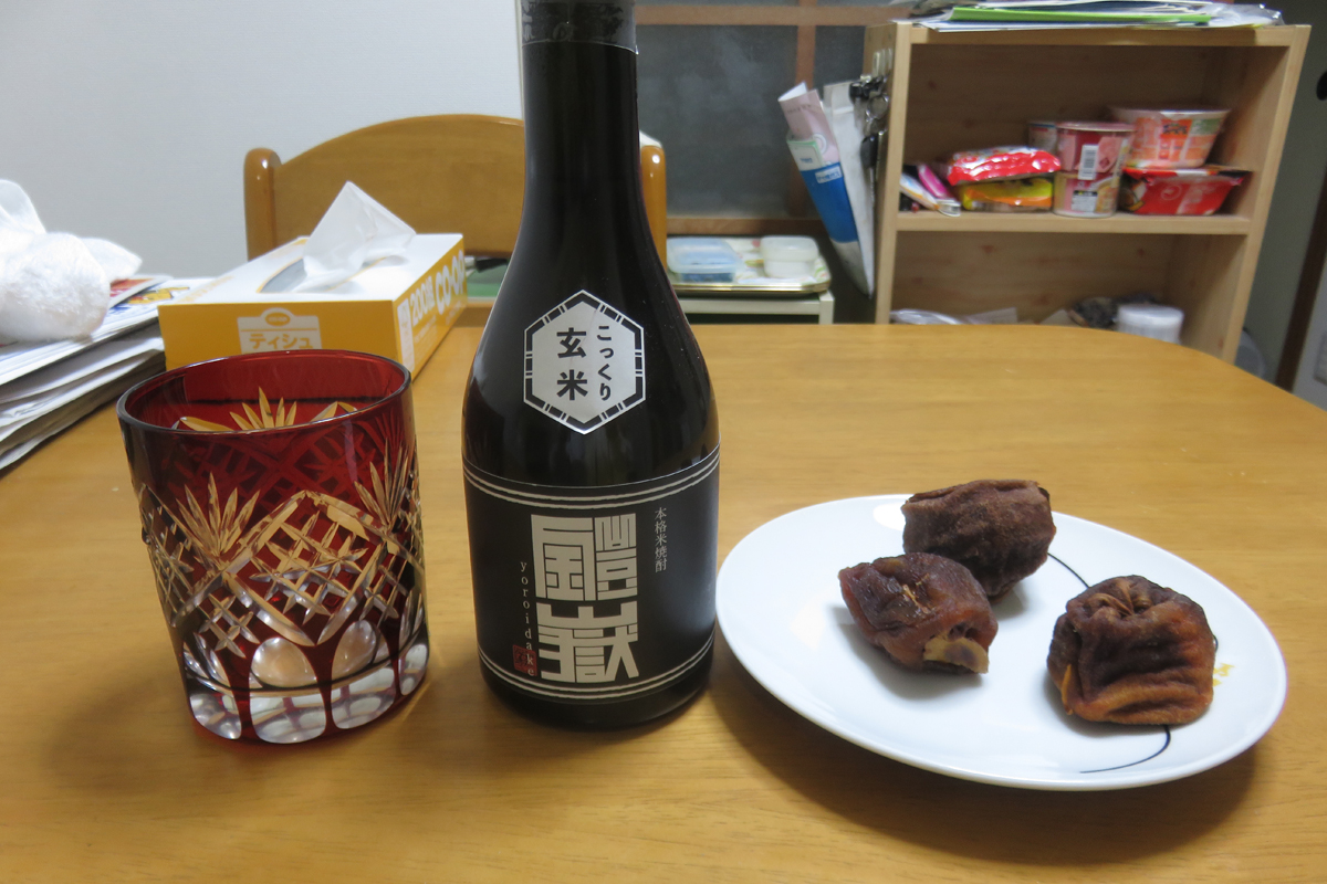 曽爾村のすすきのツアー 自分へのお土産として買った玄米の焼酎・鎧嶽 飲みました「こっくり玄米」の米焼酎・鎧嶽(よろいだけ)。曽爾村産にこだわっています。お酒のあては、H山さんの山口県からのお土産からおすそ分け。干し柿です。焼酎は炭酸で割ります。美味しくいただきました。