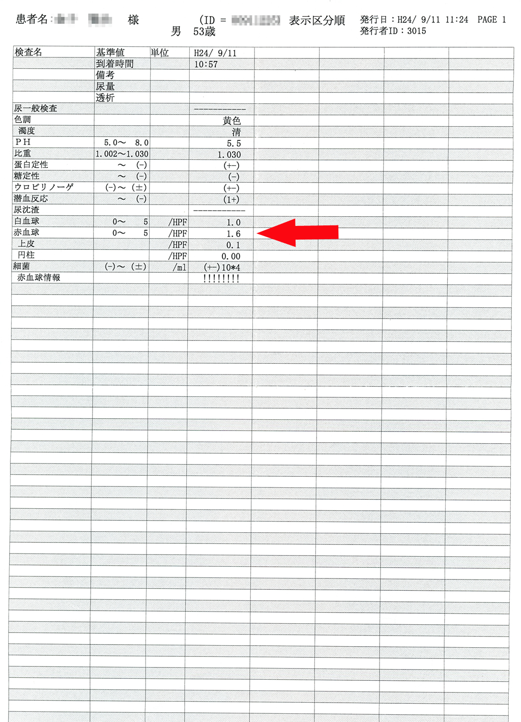 健康診断で尿の潜血反応2+が出てから、精密検査のため原泌尿器科を受診している。