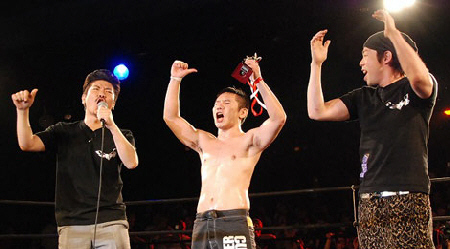 7月5日22時1分配信 オリコン 会場に駆けつけた相方・世界のナベアツ、今田耕司とともに「オモロー!」で勝利を喜ぶジャリズム・山下しげのり お笑いコンビ・ジャリズムの相方、世界のナベアツに置いてけぼりにされていた山下しげのりが遂にスポットライトを浴びた。山下は5日(土)、東京・新宿FACEで開催された総合格闘技イベント『DEEP X03』に参戦、女子プロレスラーの闘牛・空(ブルファイトソラ)を相手に2ラウンドを戦い抜き、判定ながらもデビュー戦で初勝利を飾った。ナベアツや先輩芸人・今田耕司もセコンドとして駆けつけ、最後は全員で「オモロー!」と勝利の雄叫びをあげた。緊迫感あふれるリアルファイトの模様 試合開始後、不意を突かれて先制攻撃を食らった山下だったが、5年に及ぶトレーニングを活かして冷静に体位を入れ替えてマウントポジションをキープ。途中、全身汗だくの山下に対し空選手が「ヌルヌルします」とまさかの“クリーム疑惑”を投げかけ一時試合が中断するハプニングもあったが動じず、決定打を与えなかった。 先月20日の会見では「まぁ、言うても女の子なんで秒殺ですよ」と余裕発言をみせていたが、この日は辛くも判定勝ち。ただ、常に山下を見守り、所属道場『今田道場』の道場長でもある今田がセコンドを務め、ナベアツが「(残り)さぁ~ん十秒」とお馴染みのアホネタでタイムキーパーを務める豪華バックアップに会場が揺れた。 勝利のコールを受け、トロフィーを手に山下は「何とか判定ですけれど勝利できました」とガッツポーズ。リングにナベアツや今田らを呼び寄せ、ナベアツが「僕が1、2、“3”でアホになって、その後“オモロー!”でお願いします」と促して勝利の「オモロー!」を決めた。 昨日店長会議があったのですが、そこで某ワシのマークの大○製薬様の結構偉い方が、社内表彰をするのに、「ひょ~しょ~じょ~♪」とナベアツ風にアホになってしまい、すべて持って行かれた・・・。横にいた部下、目が点・・・。チクショー!!
