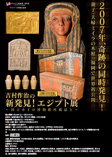 福岡市博物館にて開催されている、「吉村作治の新発見!エジプト展」を見に行って来ました。 いやー予想以上に人が多い。。展示品を見るのもいちいち並んで見なくちゃ行けないし。でも、なんかこういう古代の話って男のロマンだよねー。。。って思っていたら、ウチの嫁も大好きみたいで、二人でずっと見て、タイムトリップしとりました。3時間ぐらいずっといたのですが、3人の子供達も結構静かに興味を持って見てました。。こういうところから子供って目覚めるのかな??将来考古学者とかなったりしてね(^_^)Vミイラはいませんが、本物の棺とか・・・ふかいね~♪ファラオの呪いで写真がぶれてしまいました・・・。もちろん中は撮影厳禁でした!!行く価値アリですよ!!!