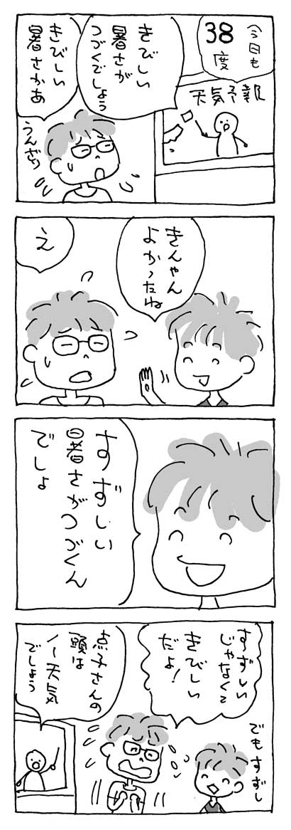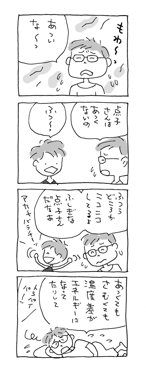 クーラーが、あいかわらずコワレテいる。木曜日に、修理が来る。それまで、あとちょっとのシンボウだ。_________点子さんがやってきた。「きんちゃん、クーラーが壊れたのは、いいことだよ」「えっ!?」「きんちゃんは、汗をかくということを、あんまりしないからね。 汗をかくのはカラダにとてもいいよ。よかったね」「そうかなあ?? よくはないけど、よかったのかもしれないかも」「そういうもんだよ。夏はにぎやかでいいねえ」「はえ」(はい、というつもりが、元気がないので、はえになる)なにがそういうもんなのか、よくわかんないけど、よかった!よかった!♪チャンチャン♪