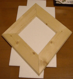 オーナメントが出来上がったのですが、、今回は、ベースが決まっていなくて、、(~_~;)kinohakoメンバーにいろいろとアイデアをもらい、、、円形を脱して、ひし形にしました。ところが、、、ひし形、対角線を70センチ、と60センチにして、、、ダンボールで仮製作し、、、、いざ木を切る段になり、、、角度は???木を買いに出かけた先のホームセンターのお兄さんに聞いてみると????しっかり、考えていただきました。やさしい、親切な方でした。ありがとうございました。結局、帰って、50度と40度の角度で何とかなりました。算数が????どうしようかと思ったのですが、相手は木です。ピッシリ行くはずありませんもの、、、、、ベースのひし形を作るのがこんなに大変だとは、、、、端の部分は、ひょうたんのトリマーでオシャレに、、、、