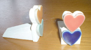 「ドアストッパー」は、木でハート型にカットした上にタイルを貼りました。可愛いのができました!!!「メモ帳台」は、これもベースは「木」で、ターコイズブルーを塗っています。タイルをあしらって、、、これも可愛いでしょ!